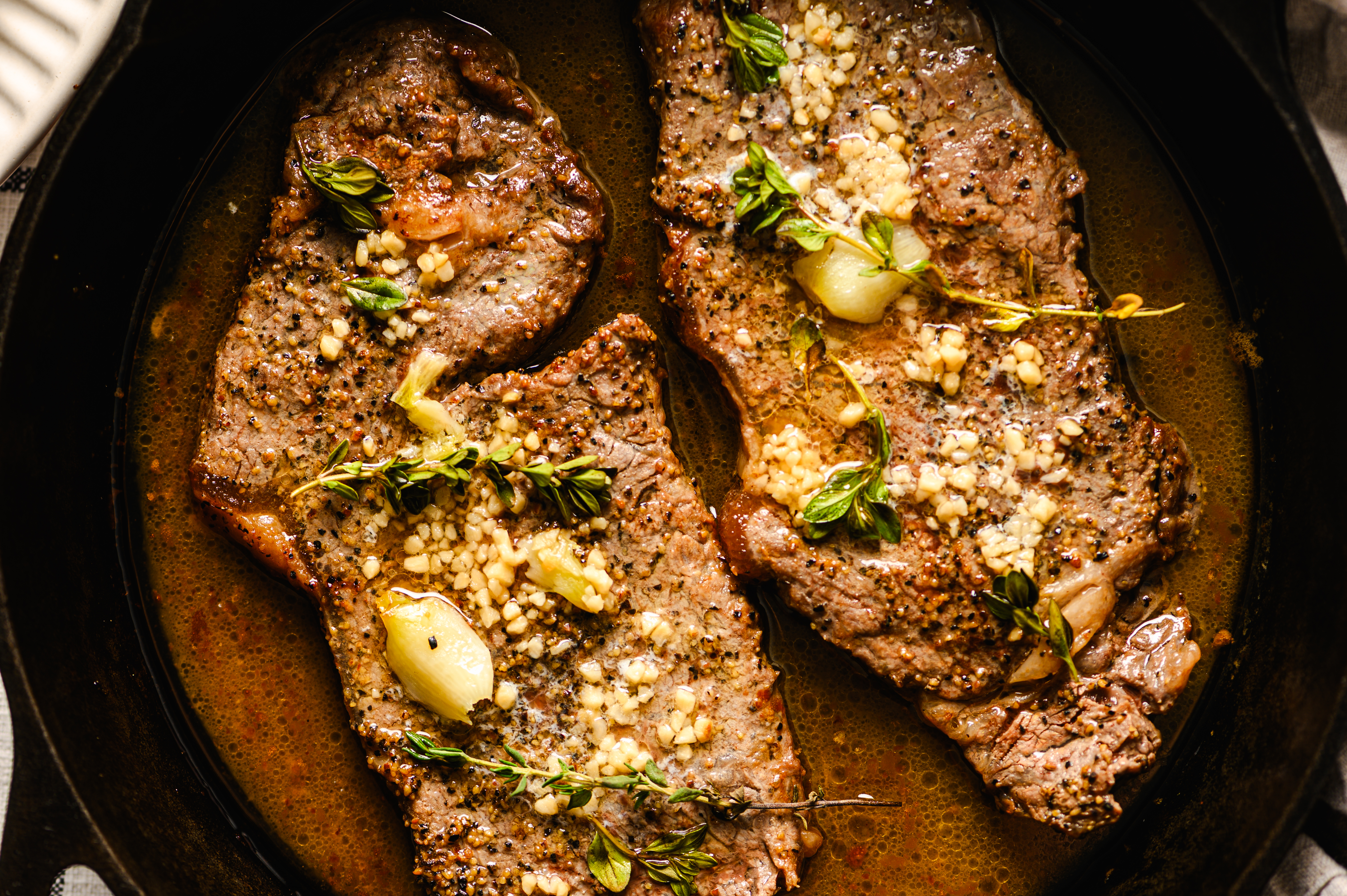 The Cast-Iron Strip Steak wants to make the most of one of the most tender cuts of beef around, and it sure succeeds! Pan-seared to a gorgeous golden-brown, infused with garlic right into the meat, and coated with butter and thyme, this main course is more than marvelous; it shows how steaks should be done! Cast-Iron Strip Steak is a five-star dish that you'll be craving again immediately after enjoying it!