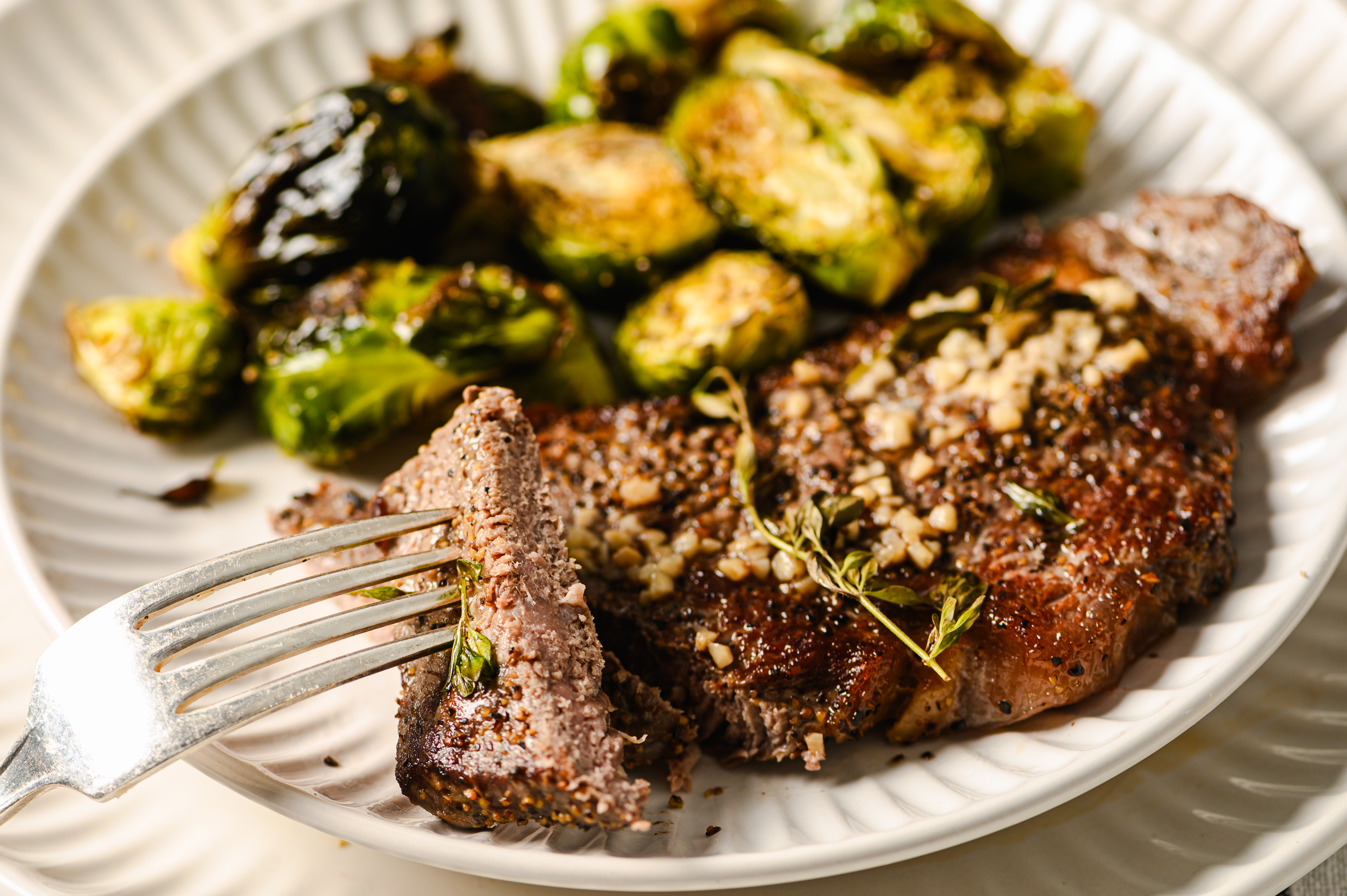 Step 8 -Add an even amount of the butter and the thyme sprigs to the top of each steak.