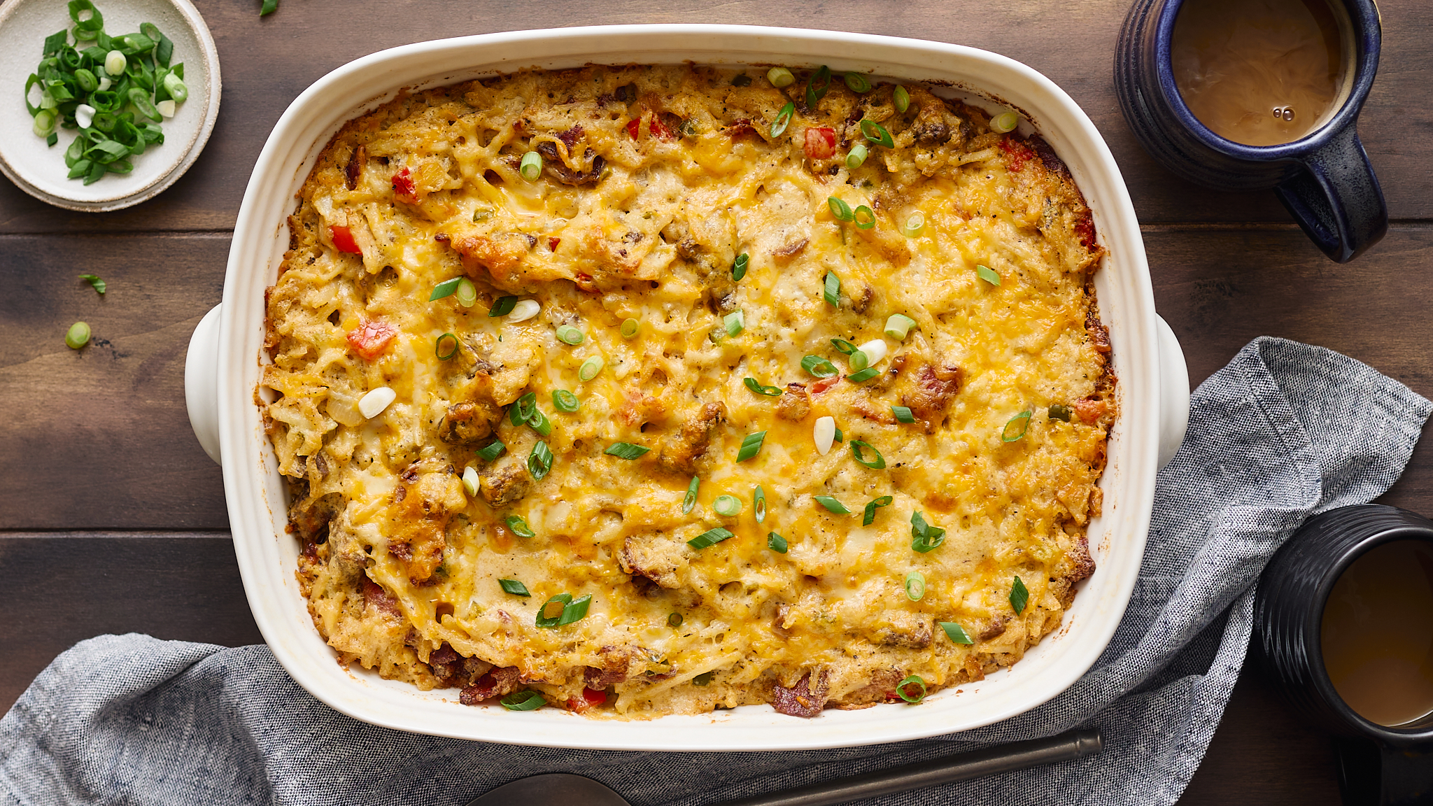This isn't ordinary hash. Oh no, this is something beyond ordinary. This is something special. This is the Cheesy Steak Breakfast Hash. Are you hungry in the morning? After this, you may not be hungry until dinner. Crisp hash browns, bites of juicy steak and succulent bacon, fresh garden vegetables, all swimming in a homemade creamy cheese sauce... there's nothing heartier or tastier than Cheesy Steak Breakfast Hash. Time to make today a little less ordinary!
