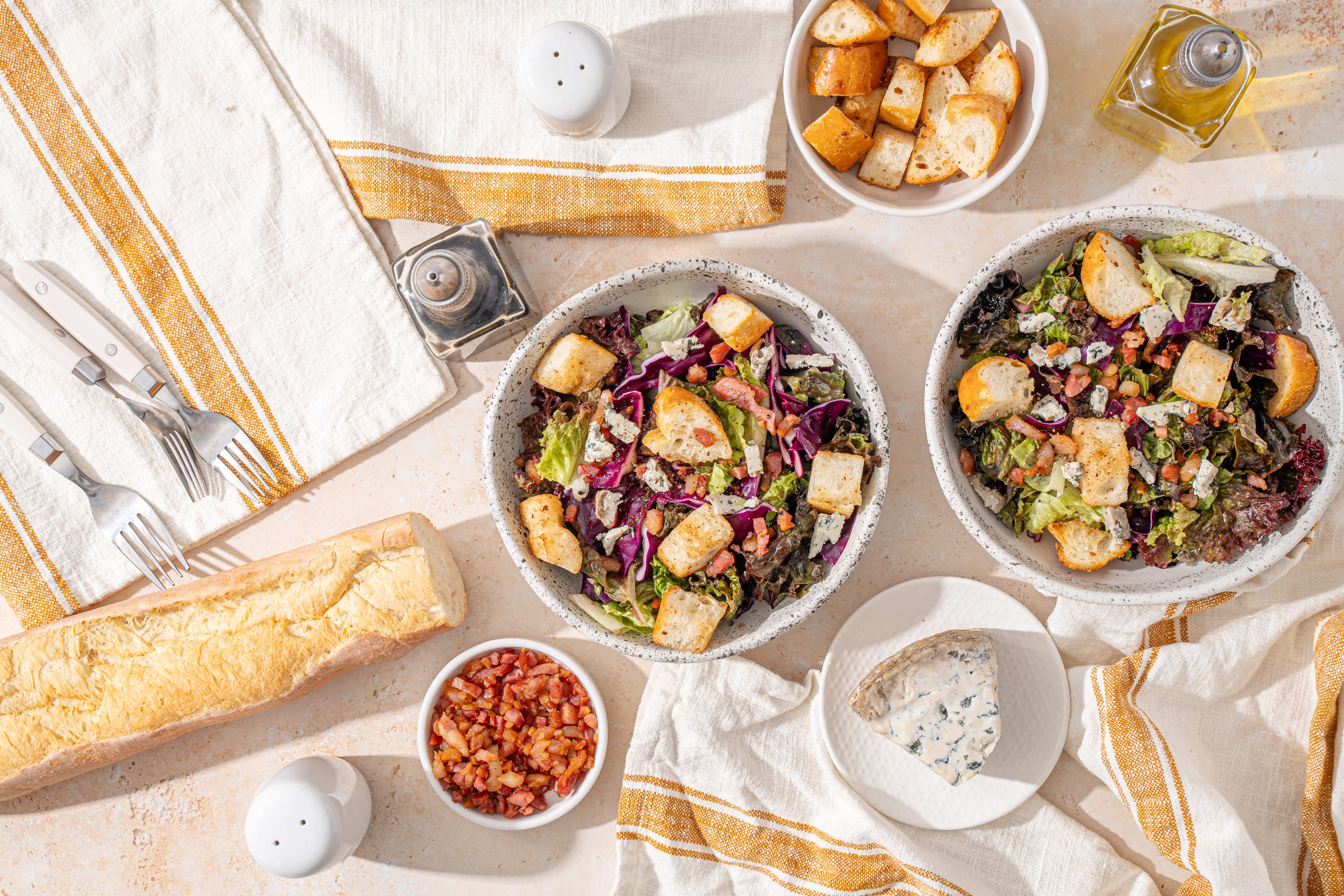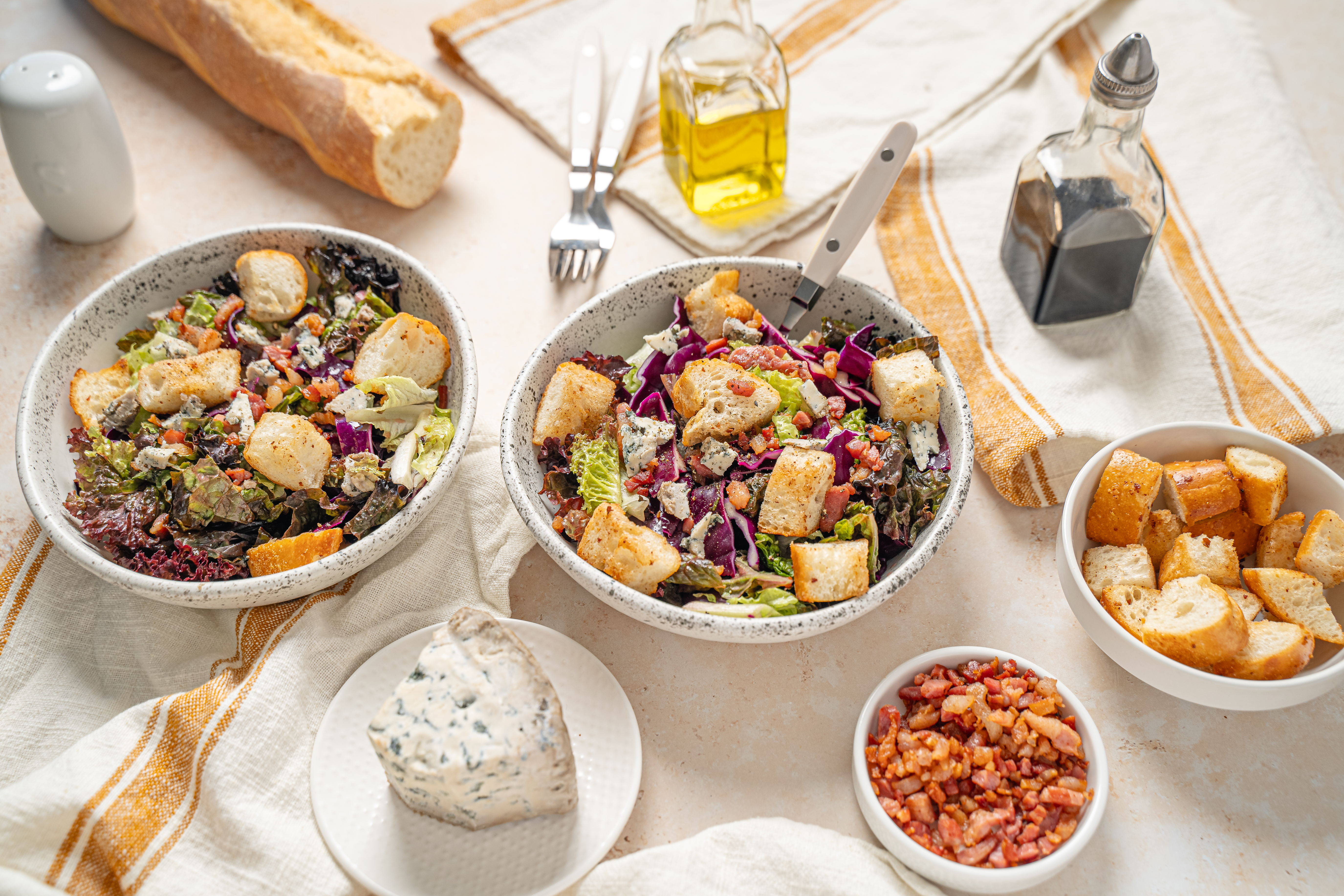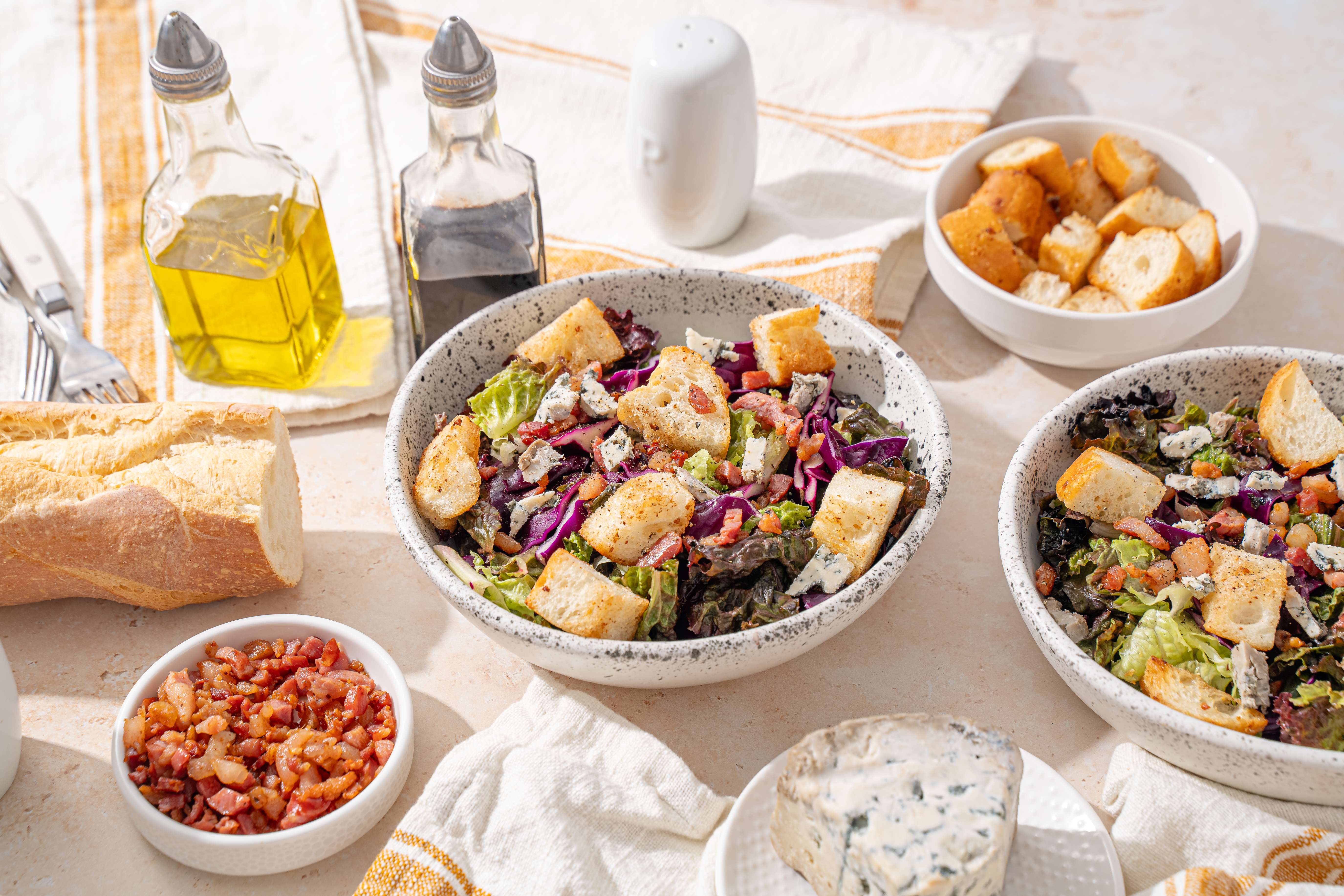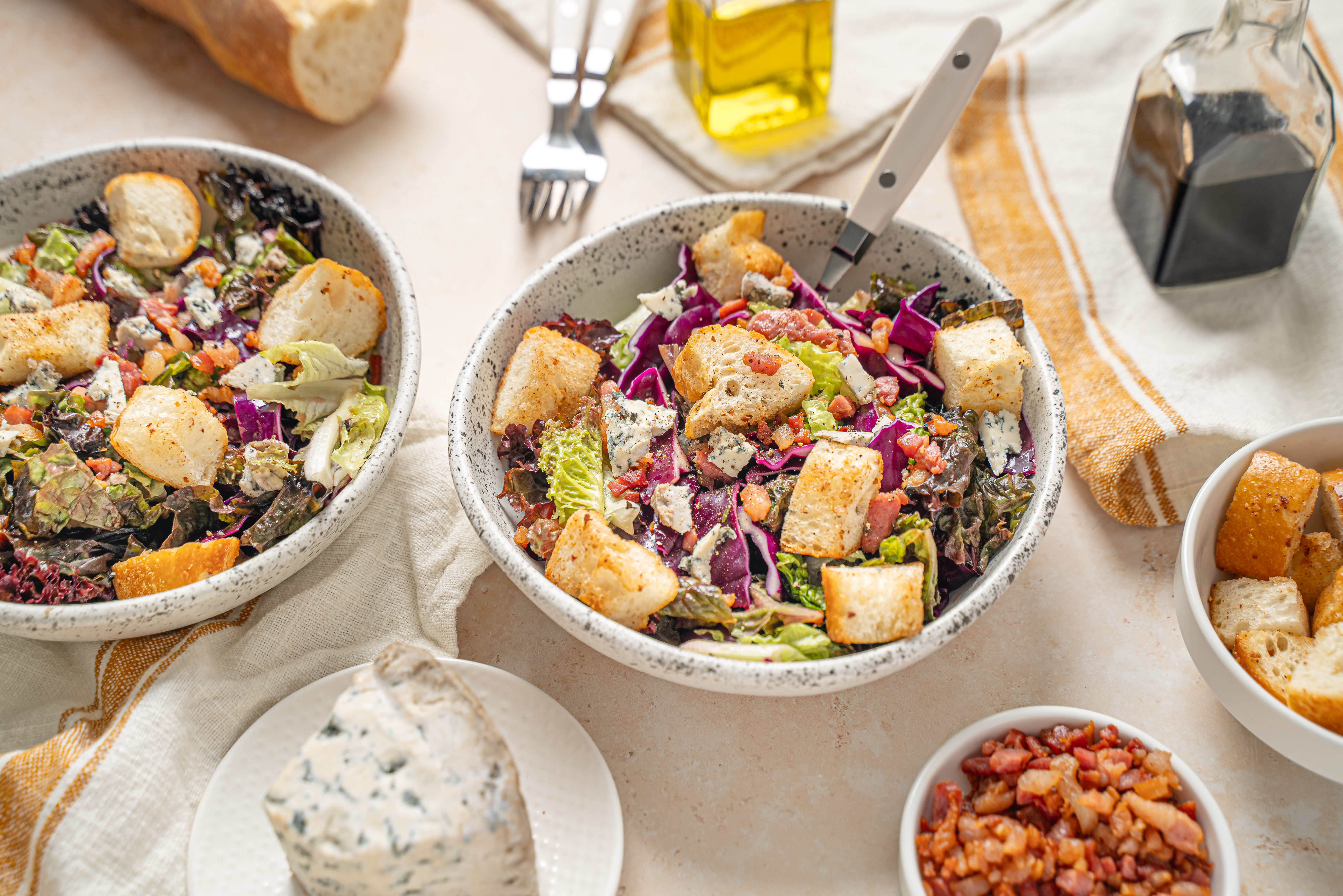 Listen, we all get the blues during the holidays. It's natural; so much pressure to be cheery can certainly have the opposite effect. So why not find new ways to turn that feeling around? Our favorite way to cure the blues is to find some blue cheese! And Christmas Blues Salad uses that tangy, funky cheese with aplomb! Fried, succulent pancetta, toasted buttery baguette cubes, and crunchy red lettuce and radicchio all come together with blue cheese and a simple balsamic dressing for a wonderfully satisfying and happiness-producing dish! Best of all, Christmas Blues Salad is ready faster than Santa can fly around the world! Time to give the holiday blues the boot!