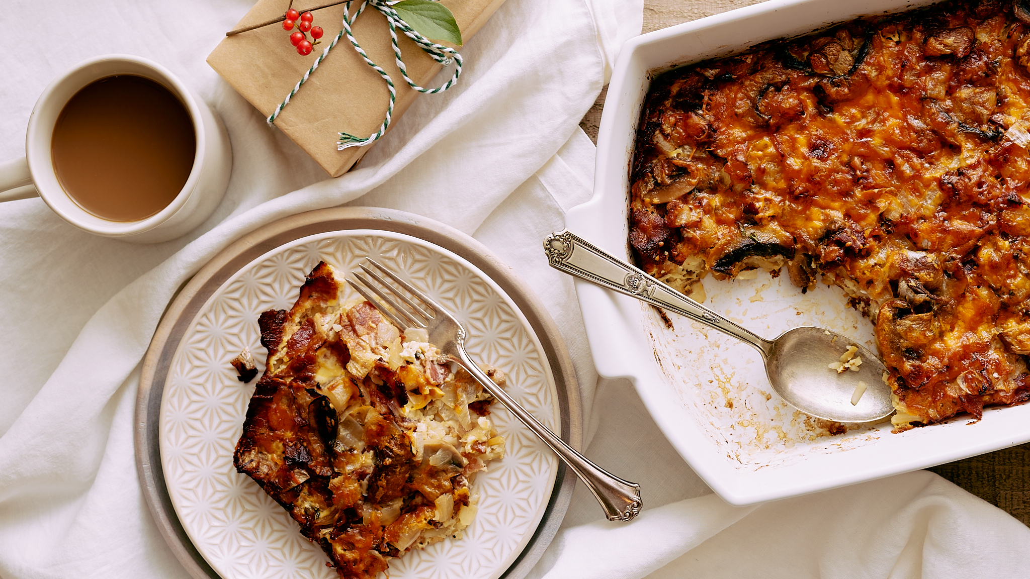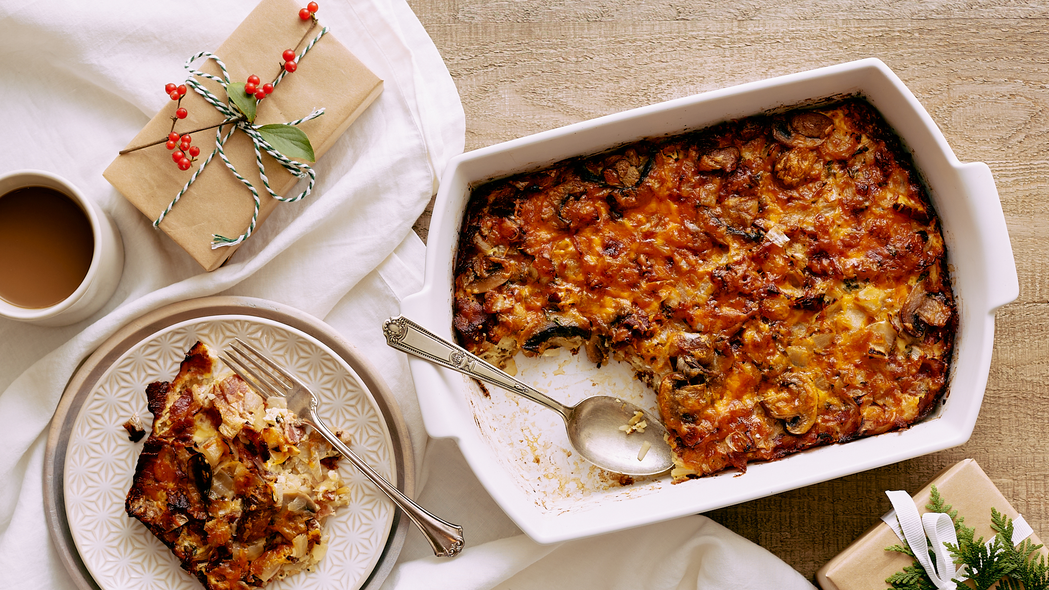 If you're hosting brunch on Christmas morning, the last thing you need to be doing is rushing around the day-of trying to make things perfect. Christmas Brunch Casserole is prepared the night before to make sure the brunch is as smooth and splendid as possible, while still serving up a hearty, happy meal as well! Cheesy eggs, crunchy hash browns, succulent bacon, and beefy mushrooms all come together to make Christmas Brunch Casserole like Santa's giftbag of wonderful morning flavors! The holiday cheer is in the morning air when this casserole is on the table!