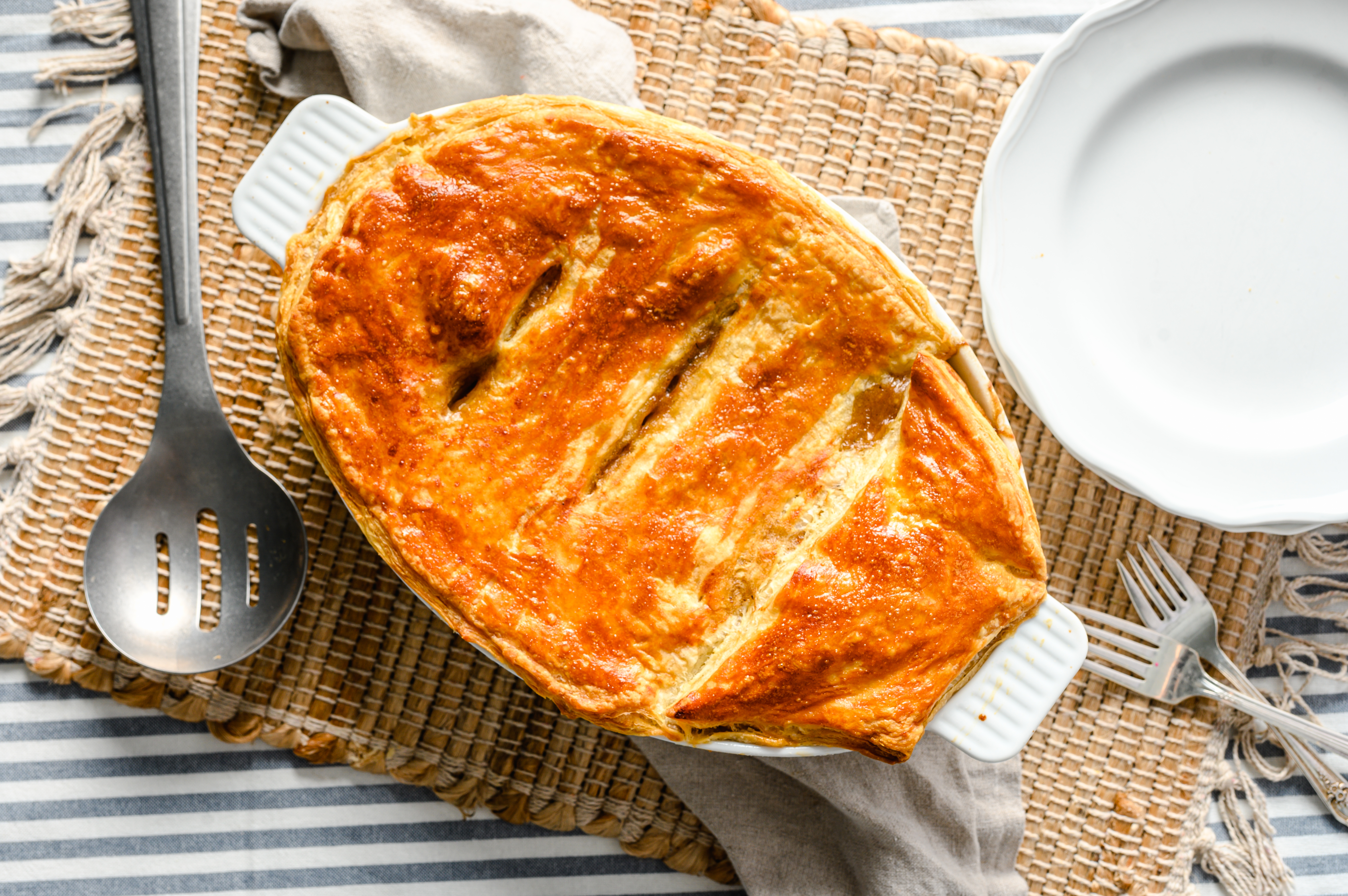 Step 30 -With a sharp knife, cut a few slits into the puff pastry topping and bake until deep-golden and the filling is hot in the middle, about 30-35 minutes.