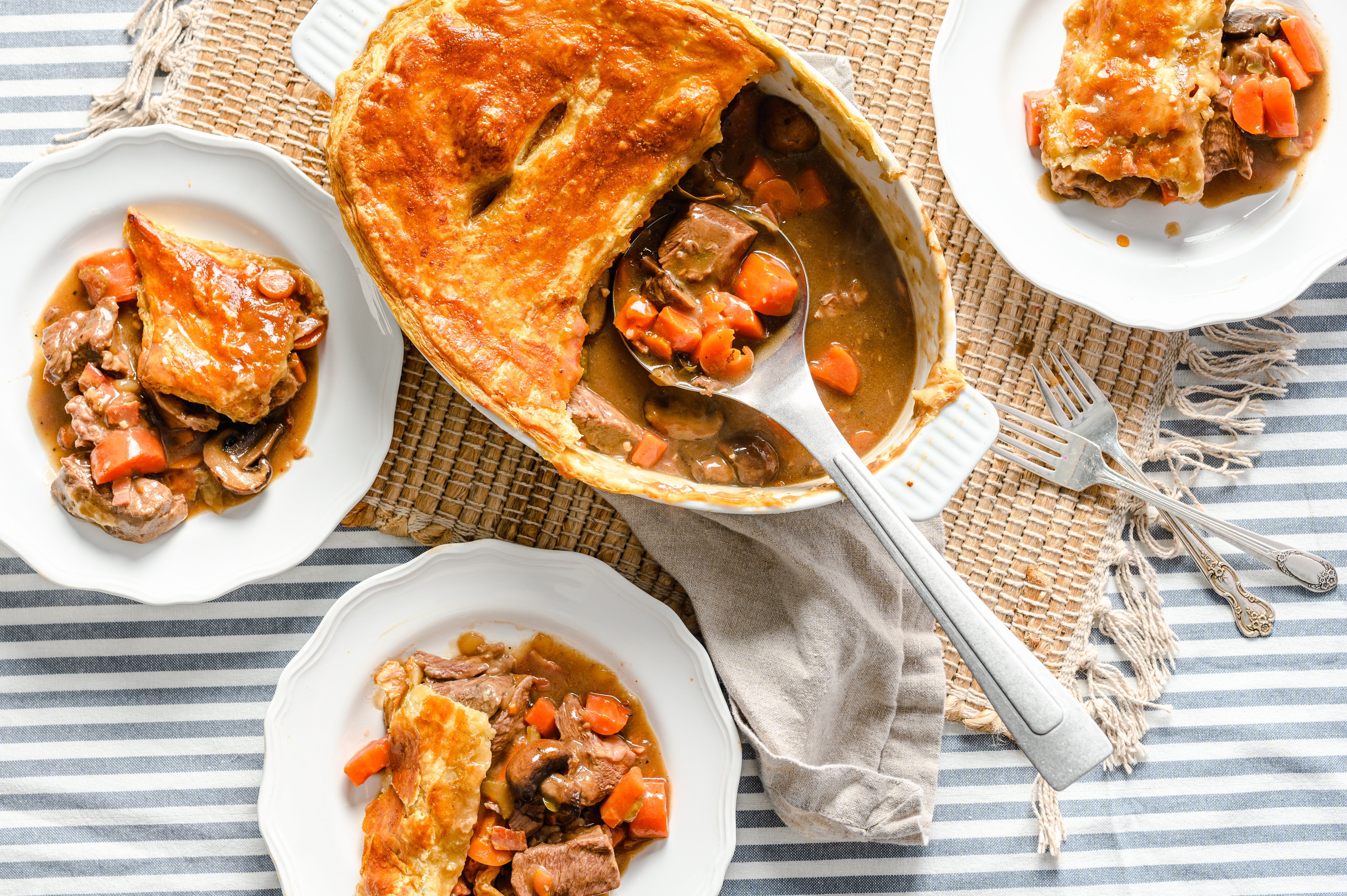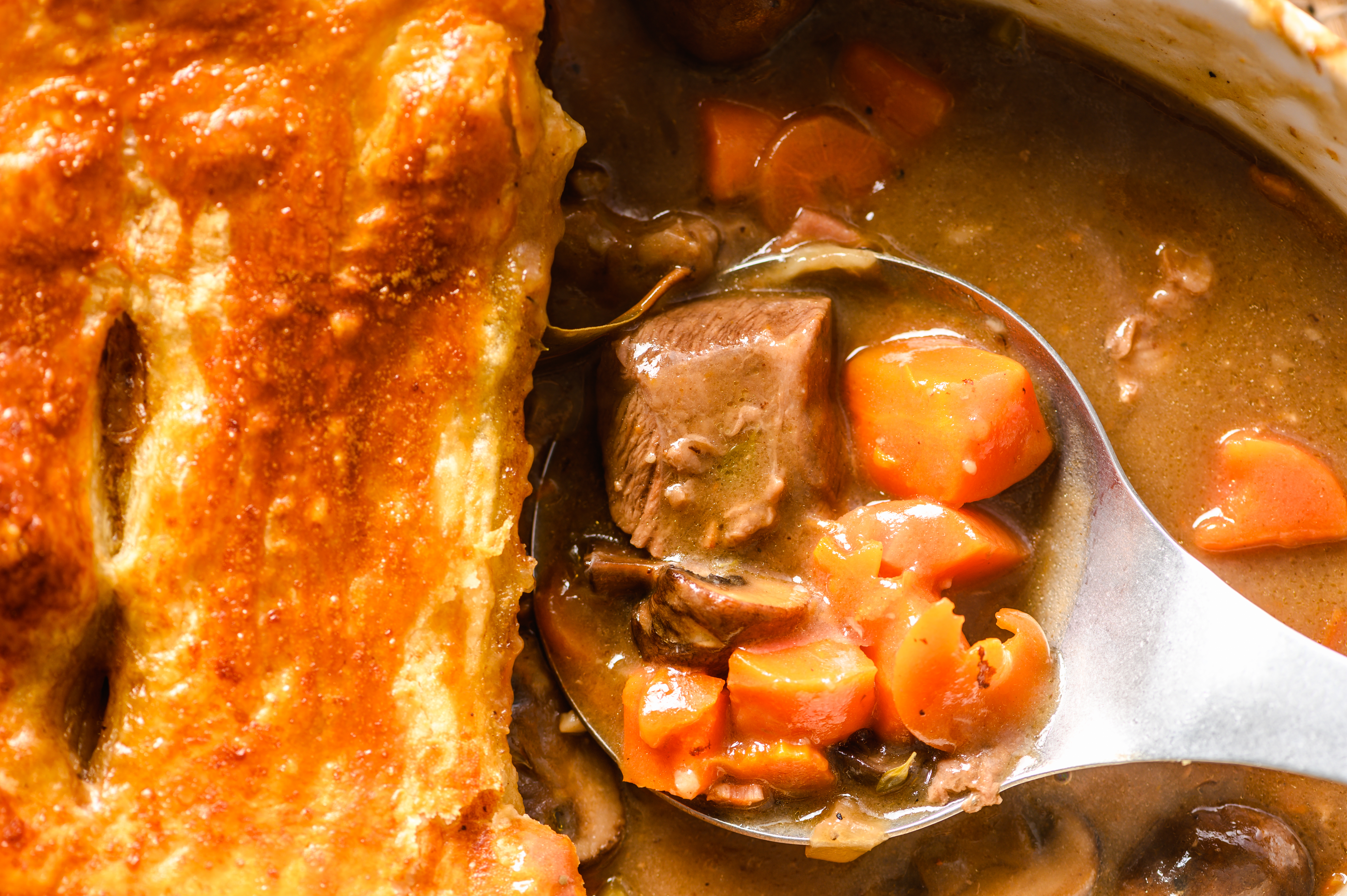Looking for a legendary loaf of luxury? The enormous expectations the Epic Beef Bake exceeds are beyond anything your beef-loving mind can imagine! A colossal concoction of tender chuck beef pieces, sizeable amounts of monumentally savory-seasoned mushrooms and triumphant sweet carrots, all swimming in a thick, finely-tuned sauce and enveloped by a tremendously flaky puff pastry crust that will literally dazzle you. This Epic Beef Bake will put the wow back into your dynamic dinner. It's truly an undaunted discovery of epic deliciousness!