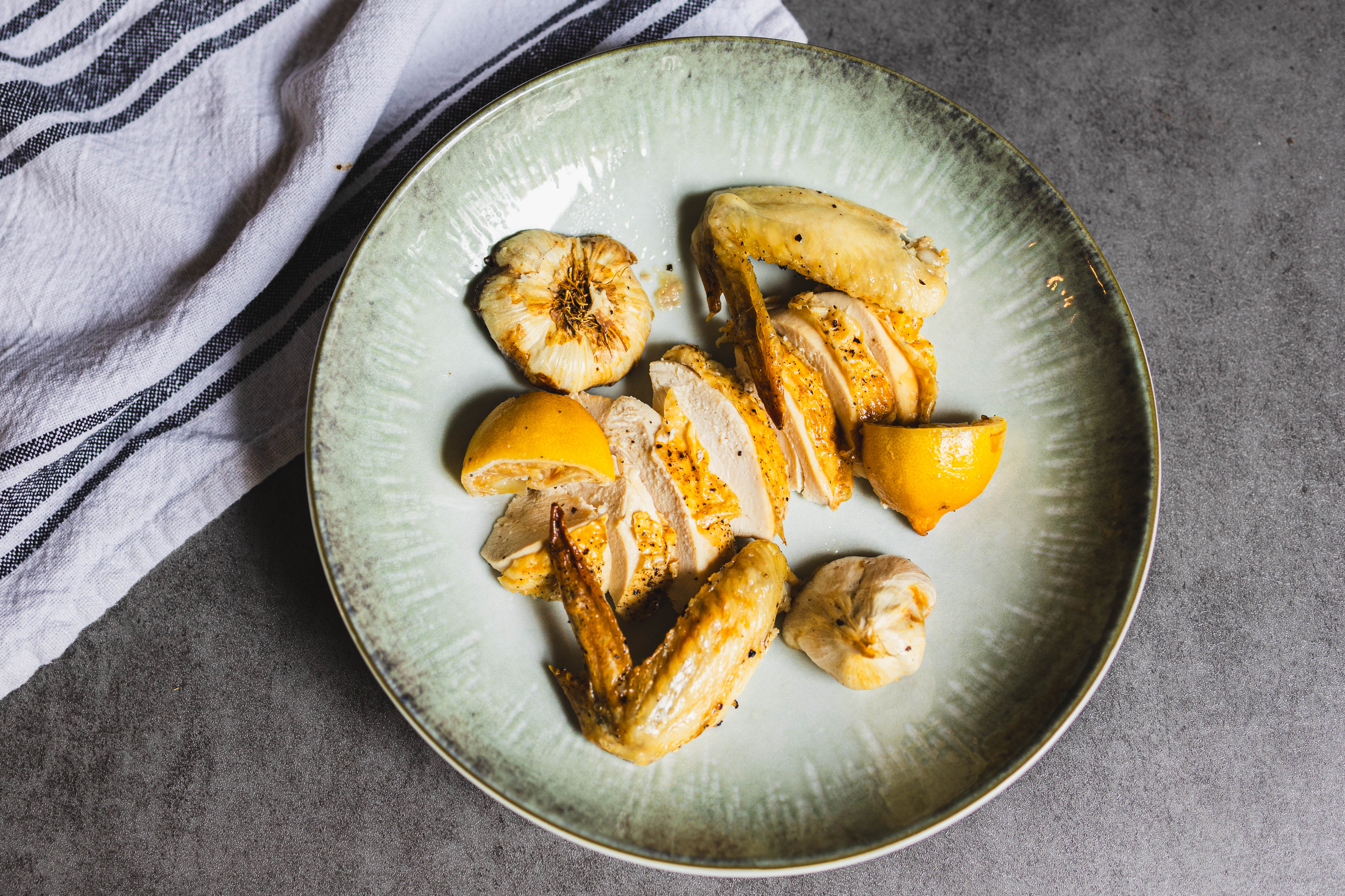 Step 10 -Slice and serve the chicken garnished with the roasted lemon halves and the roasted garlic halves.
