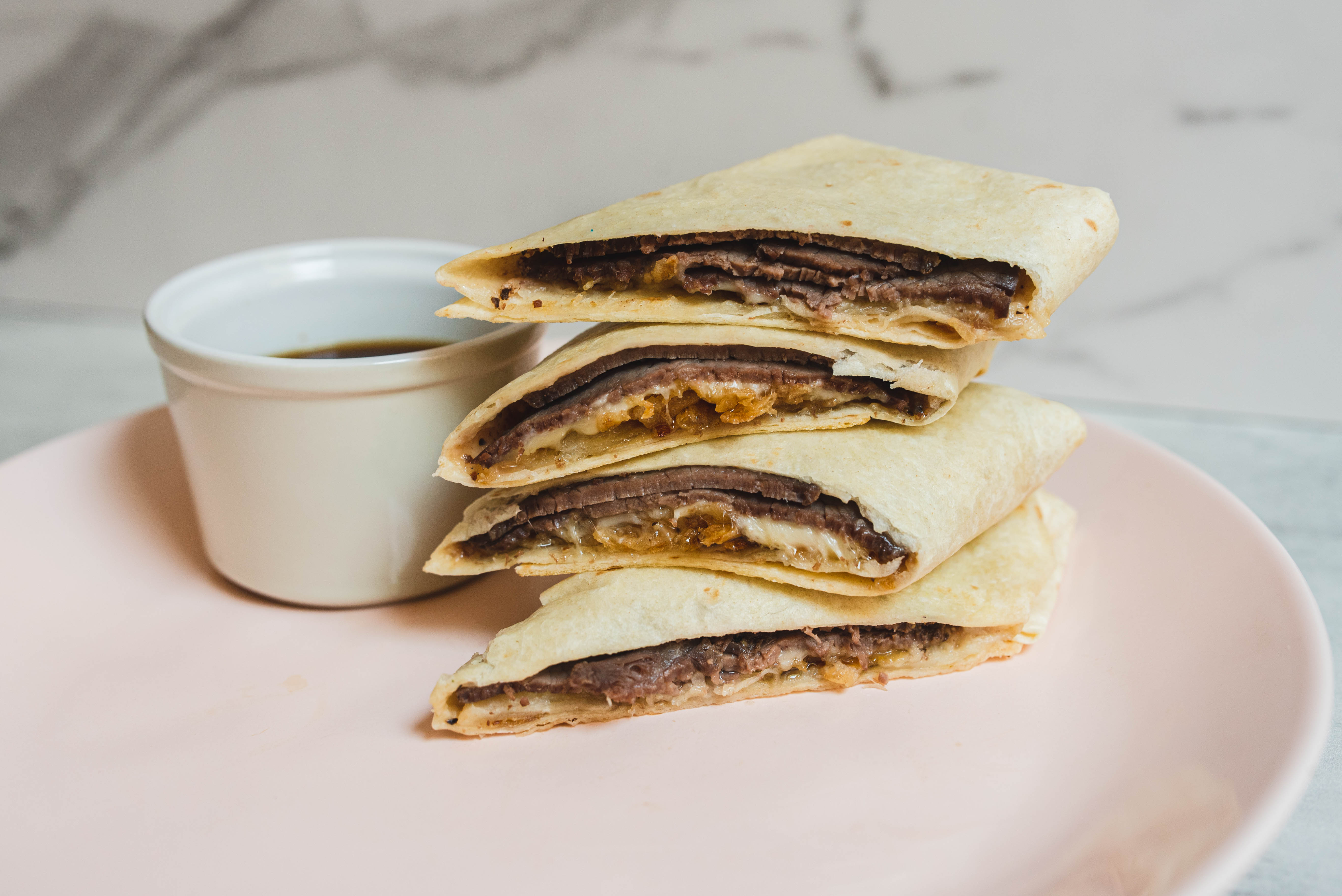 Let's simplify the classic French Dip Sandwich and make it a quick and delicious lunch! French Dip Roll-Ups wrap melty cheese and savory beef in tortillas and bakes them until crisp! They would be an incredible sandwich either way, but it's not a French Dip without the dip; a deliciously beefy au jus sauce is just waiting to add another layer of flavor to each bite! Wrap up your hunger with these French Dip Roll-Ups!
