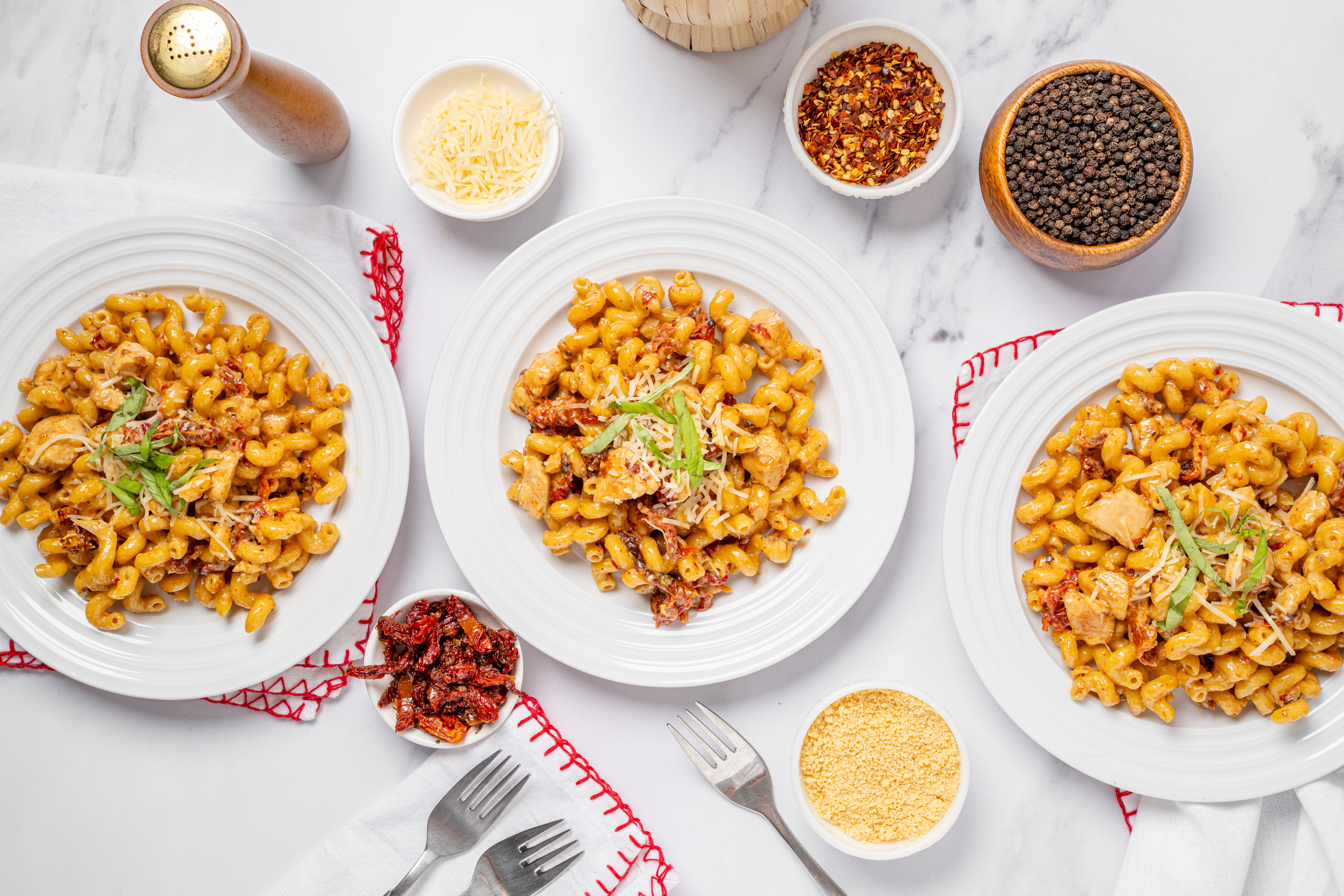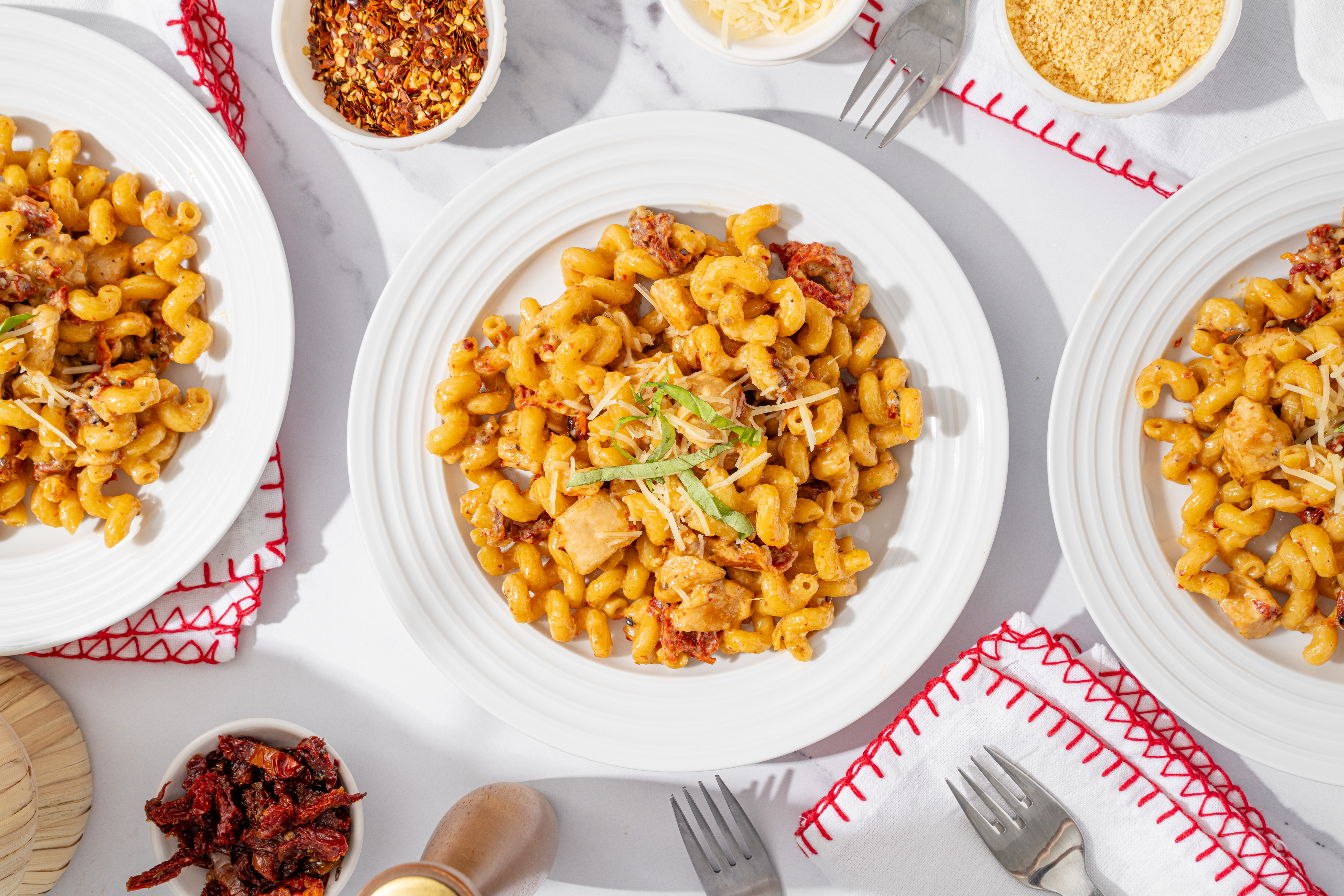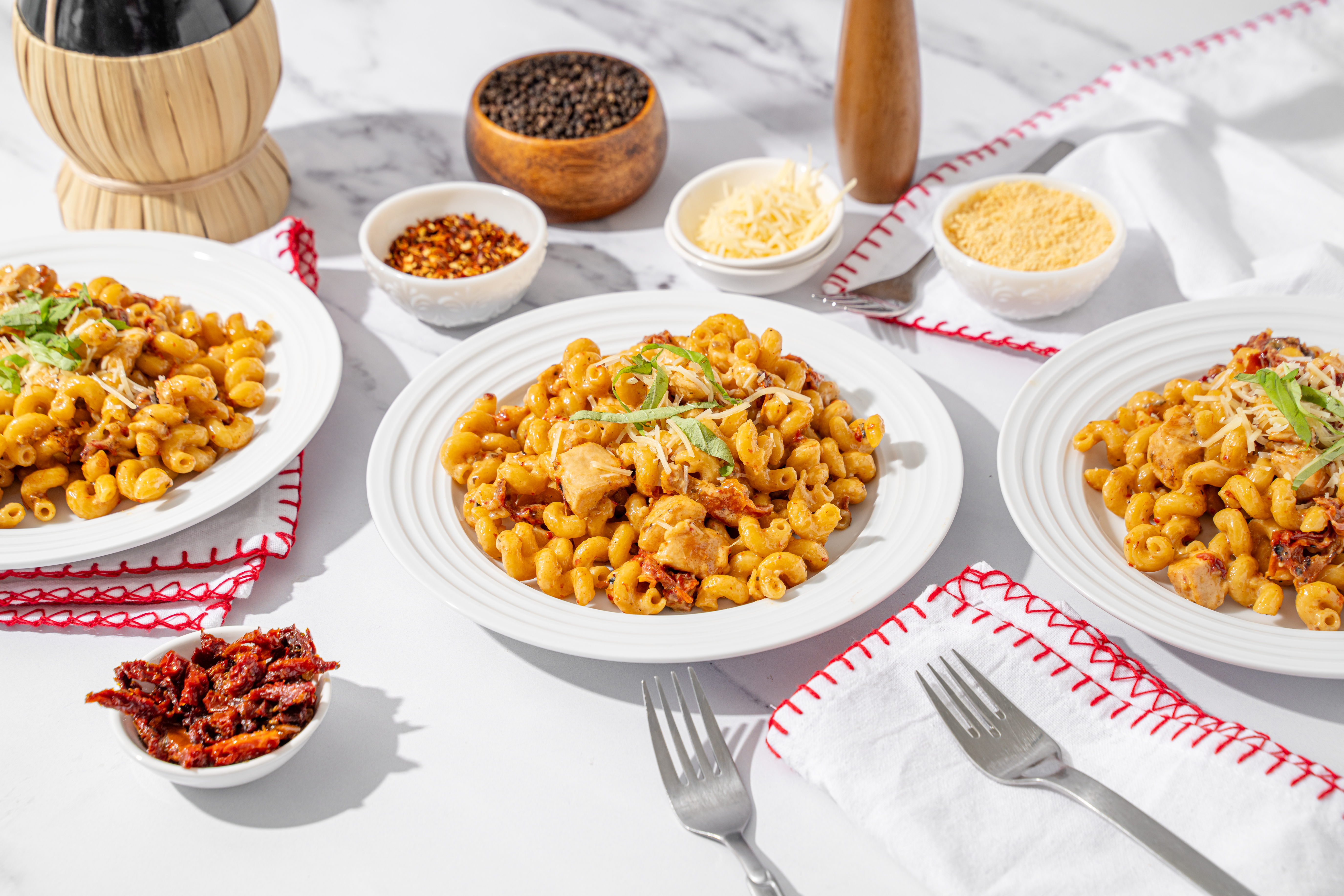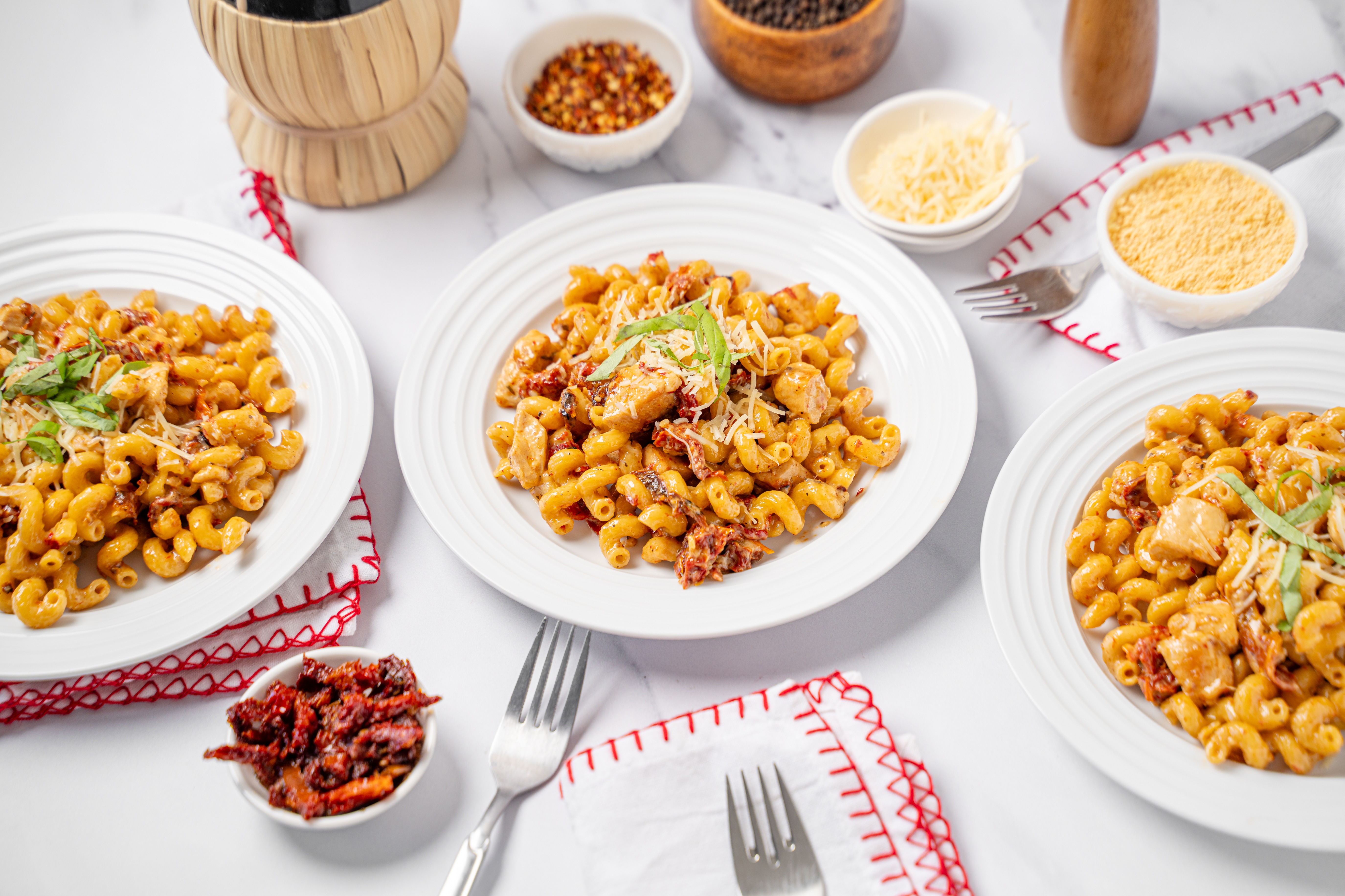 Can you hear it? It's pattering across rooftops, slinking down chimneys, and appearing under the tree ready for your taste buds to unwrap! Ho Ho Ho Pasta is a holly, jolly dish in which your favorite pasta is actually cooked in a creamy, savory, succulent sauce, with notes of sharp cheese and sweet sun-dried tomatoes. Chicken breasts and notes of fragrant garlic make this meal even more warm and welcoming, like a beautiful Christmas hearth! Here comes Ho Ho Ho Pasta, right down Santa Claus Lane and straight to your table!