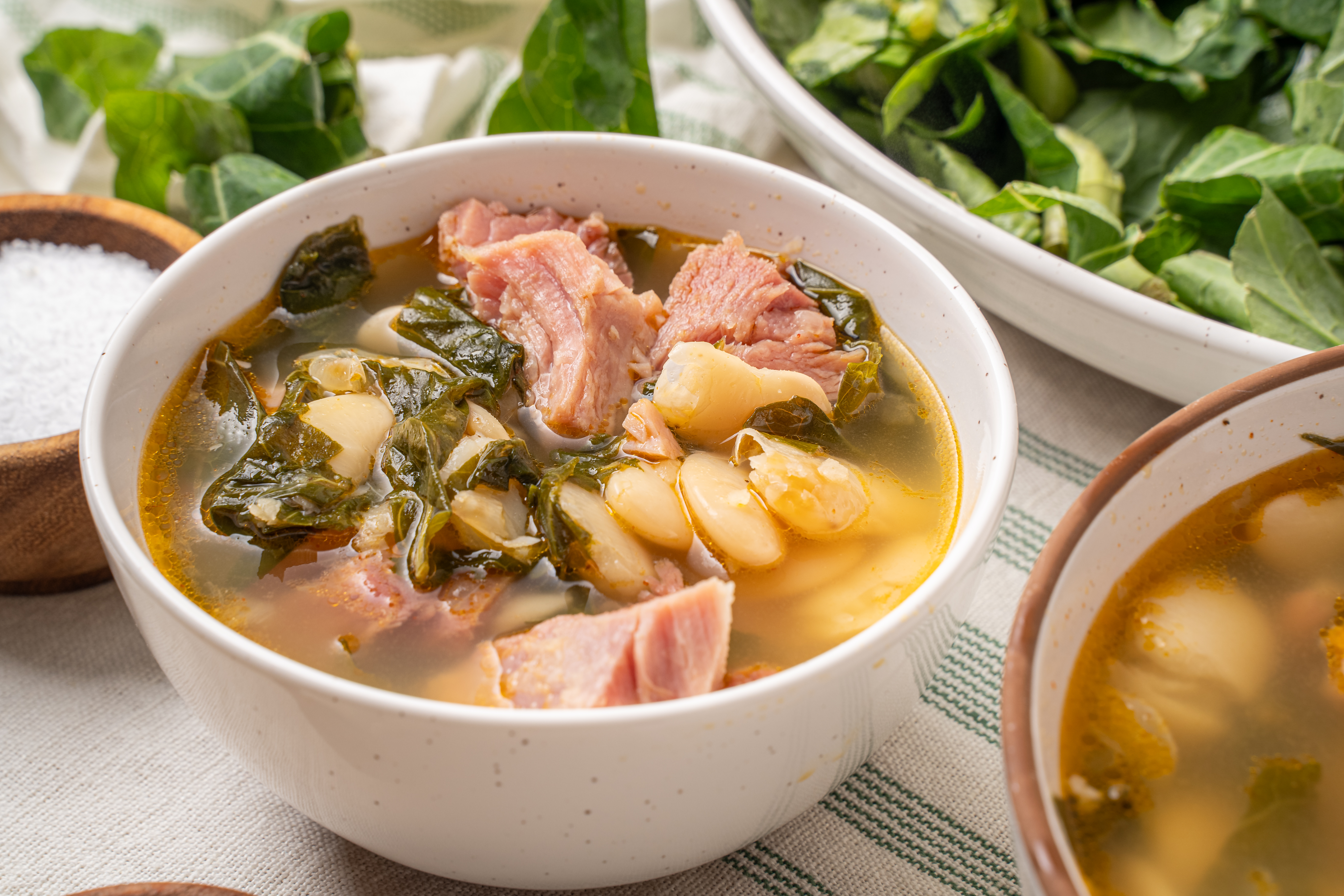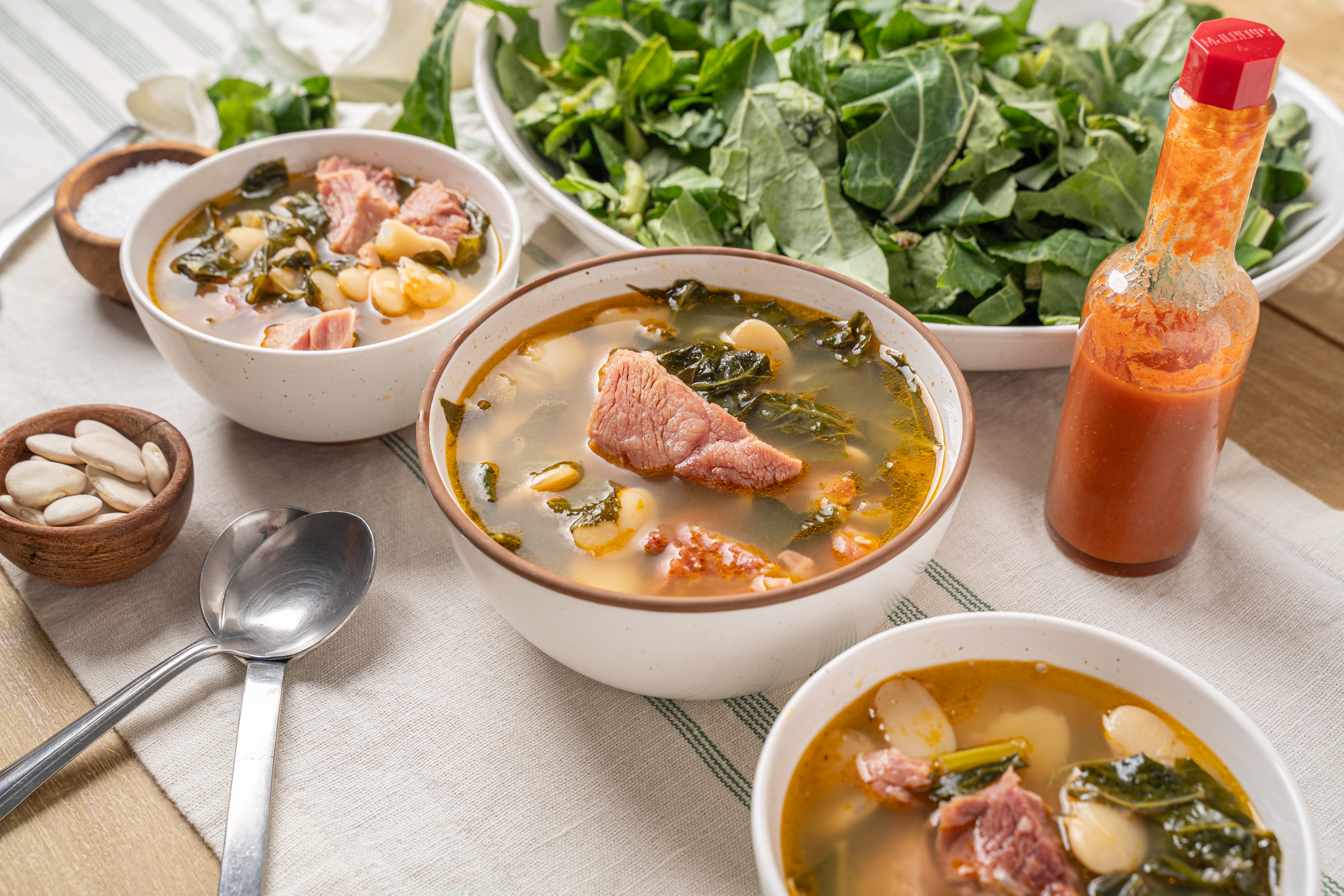 We're going home! Well... at least our taste buds are. Homestyle Collard Greens & Ham Soup takes you right back to a Sunday night at your Southern granny's house. Each spoonful comes filled to the brim with juicy pork, tender lima beans, and your favorite collard greens, all soaked in a savory, steaming-hot broth. Ahh, it's really just like grandma made it! Kick off your shoes, leave the city stresses at the door, and come home to the slow-paced, good time that is this Homestyle Collard Greens & Ham Soup! Ah, it tastes, oops, feels good to be home!