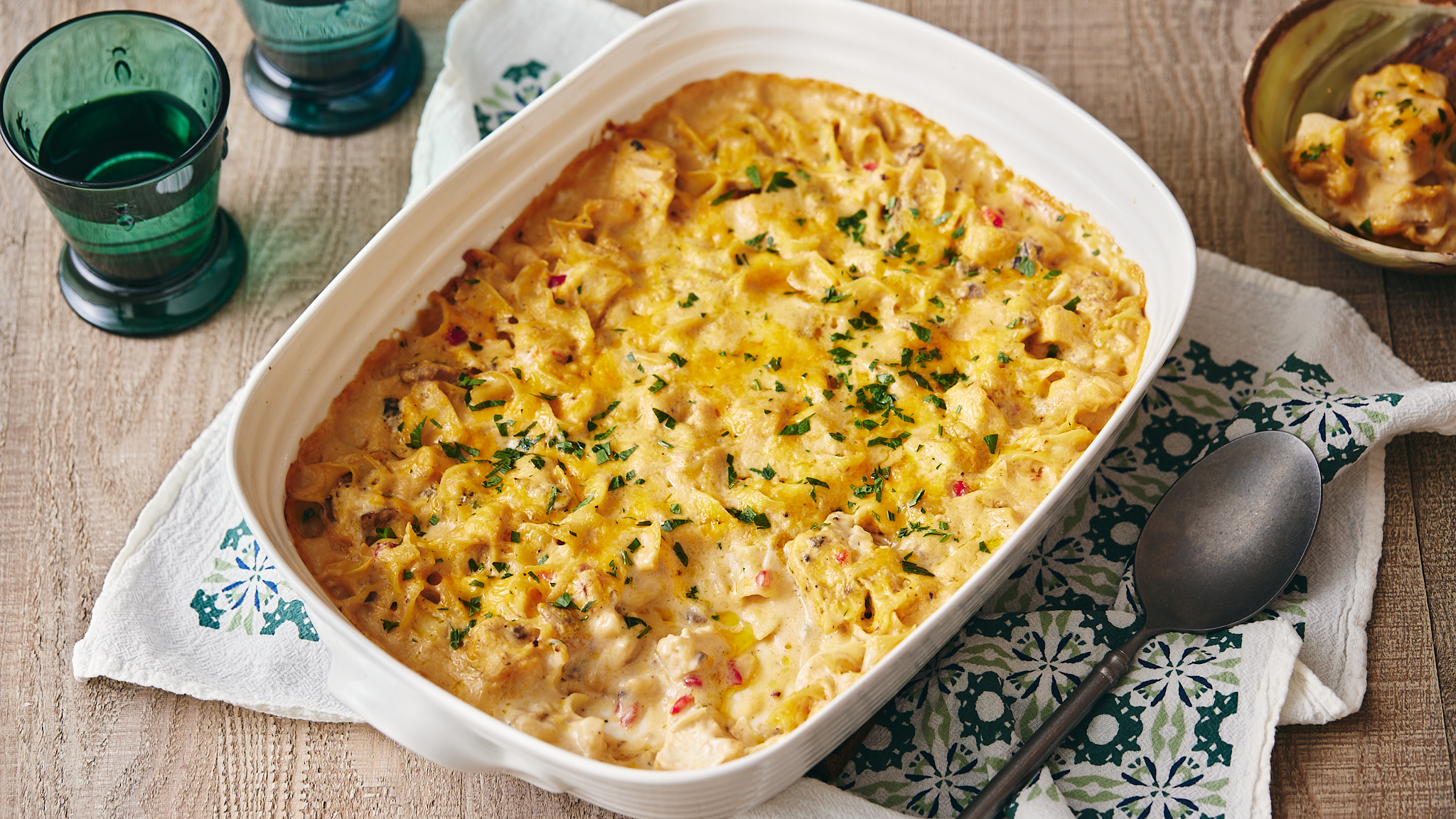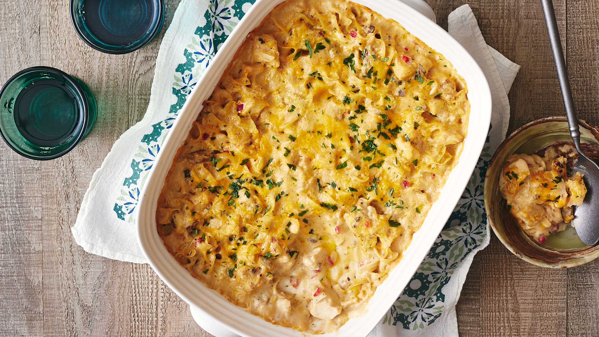 Get ready to roll out the welcome wagon! Howdy Y'all Chicken Bake will have all the good ol' boys and girls comin' down yonder to your humble abode to get a taste of something that will make them happier than a clam. And who can blame them? We'd go any distance to enjoy a casserole that's loaded with all the tasty fixin's like spicy pimentos, crunchy almonds, hearty chicken, tender egg noodles, and melty cheddar cheese... yum-a-lum! So, get your greeting voice ready and your arms ready to hug, Howdy Y'all Chicken Bake is the warmest, most hospitable welcome you can give!
