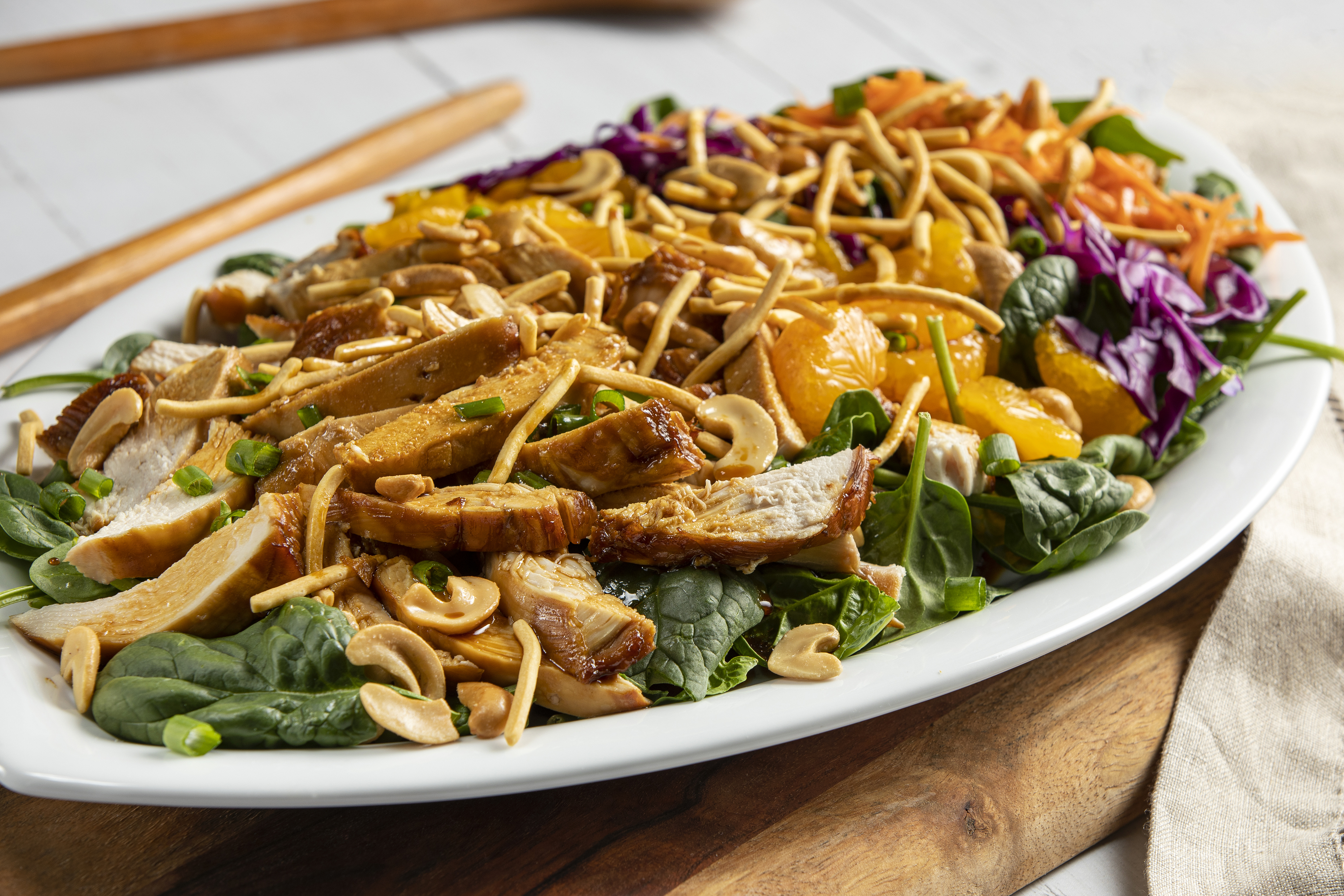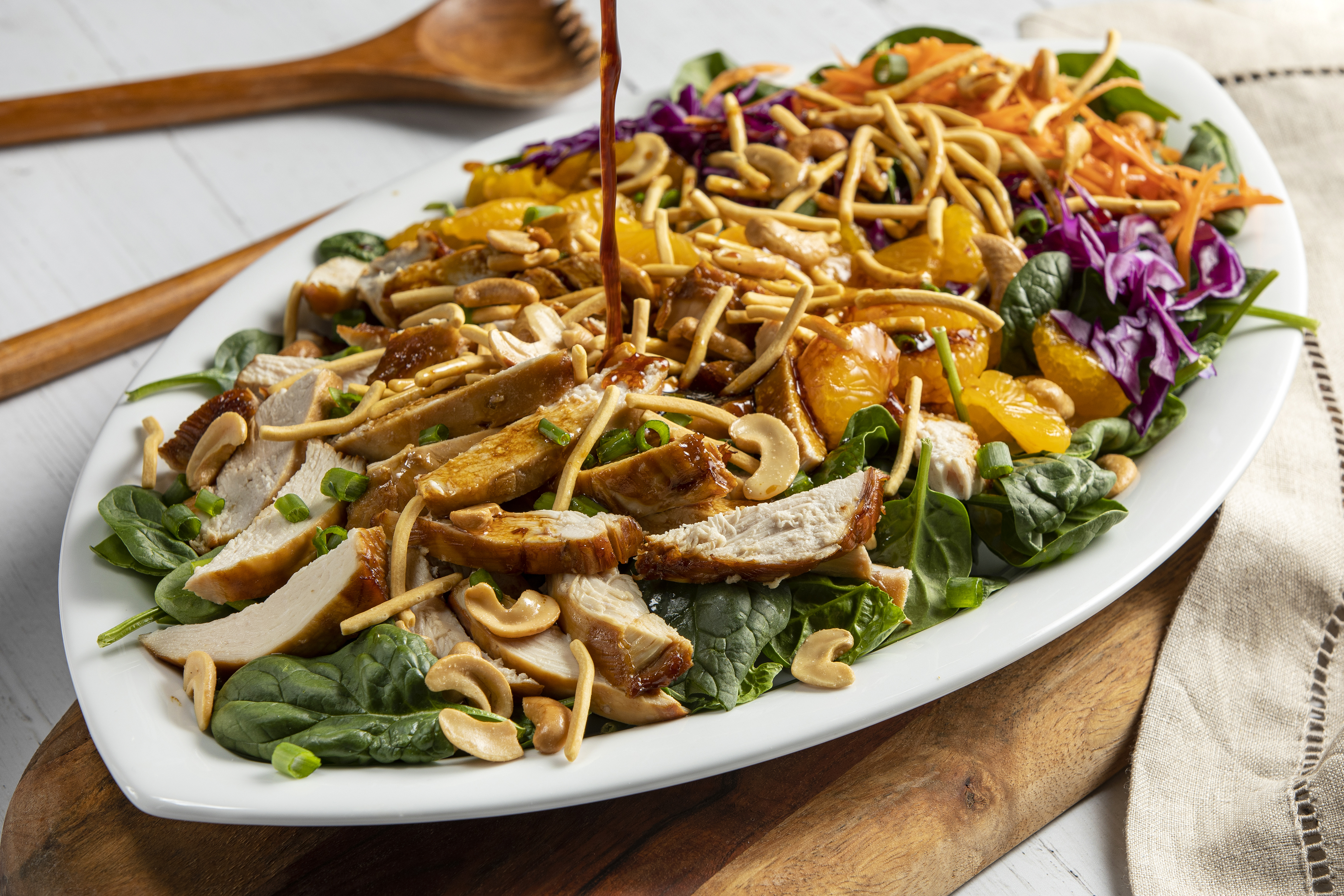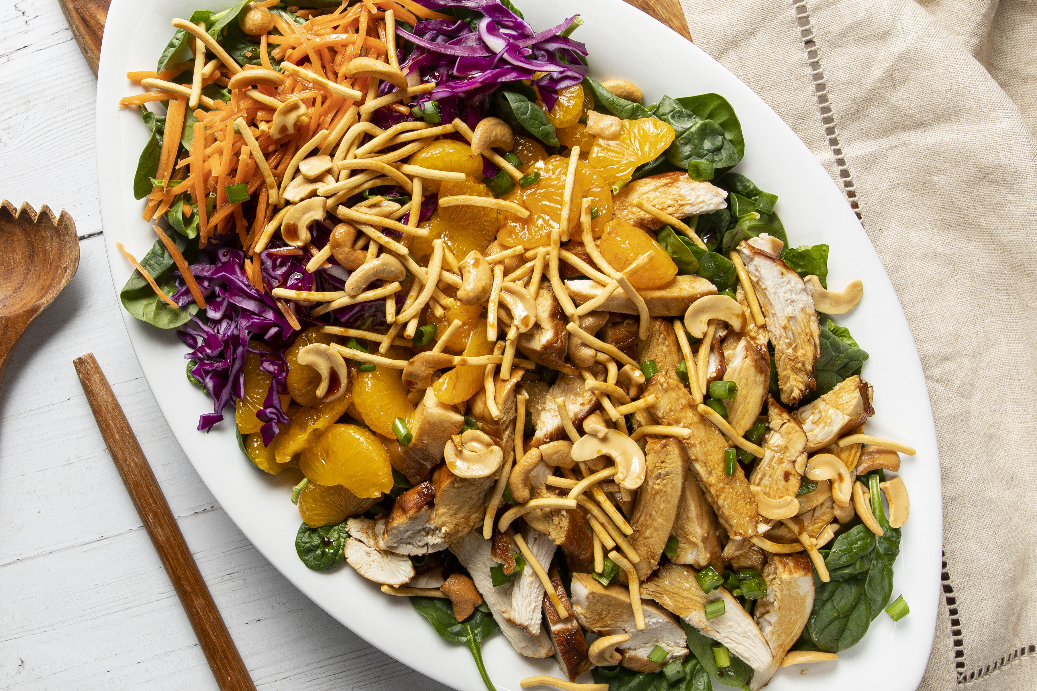 Step 11 -Place the spinach on a serving platter and top with the chicken, the mandarin oranges, the cabbage, the carrots, and the green onions.