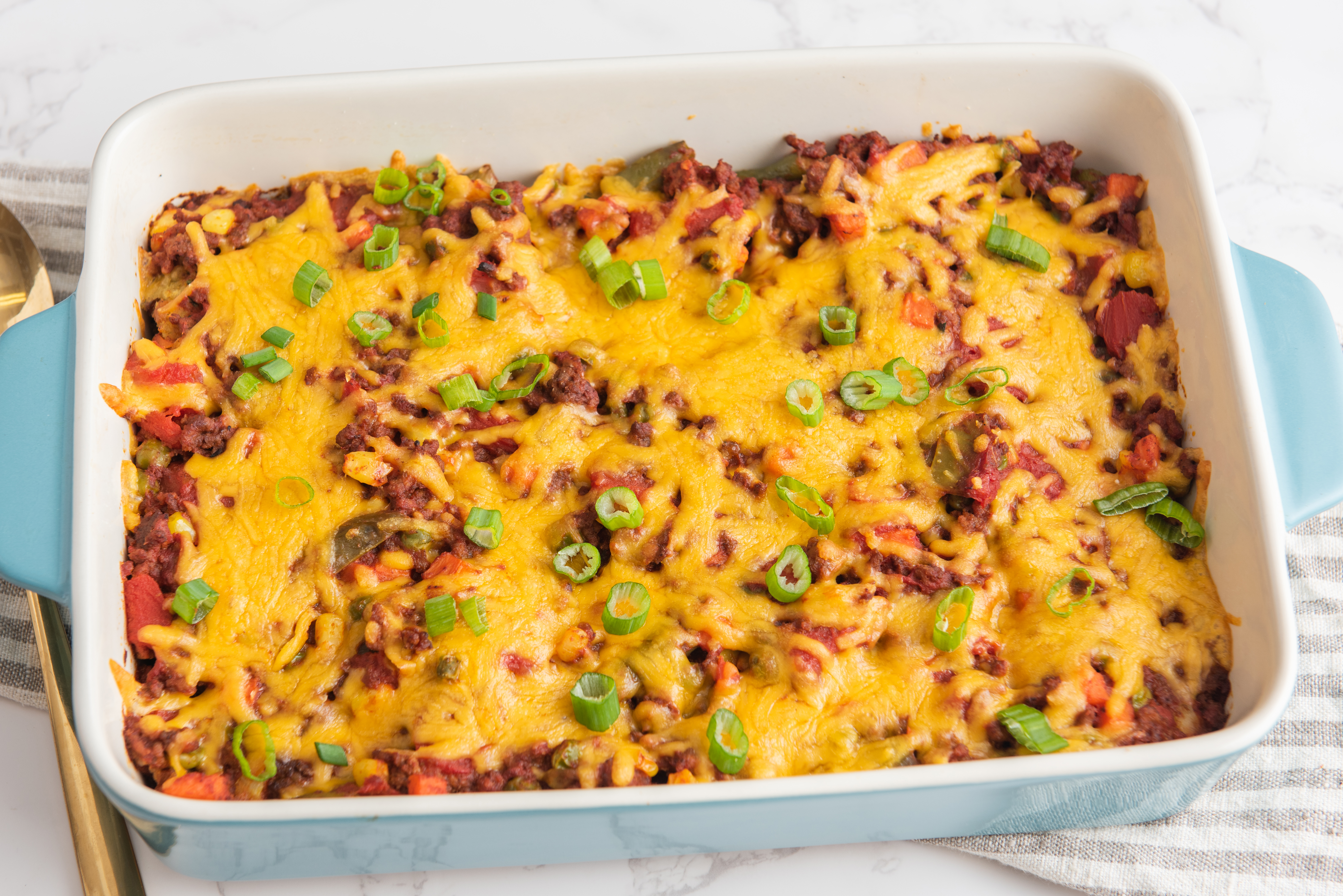 This is the Mardi Gras of all casseroles! No "gumbo" about it, this smooth and easy Louisiana Beef Bake will have your dinner boat bayou floating in no time with all the Cajun flavors you love. The jazzy, spiced-up ground beef, layered on some best-of-the-South cornbread and topped with melted gooey cheddar cheese, is just about as Louisianian as it gets (minus the crawfish)! No boiling necessary; whip up Louisiana Beef Bake in no time for the festival of flavors that your French-Quarter-loving-heart (and tummy) desire. This is the "big easy" recipe you've been looking for! Getcha some! Hooo-weee!