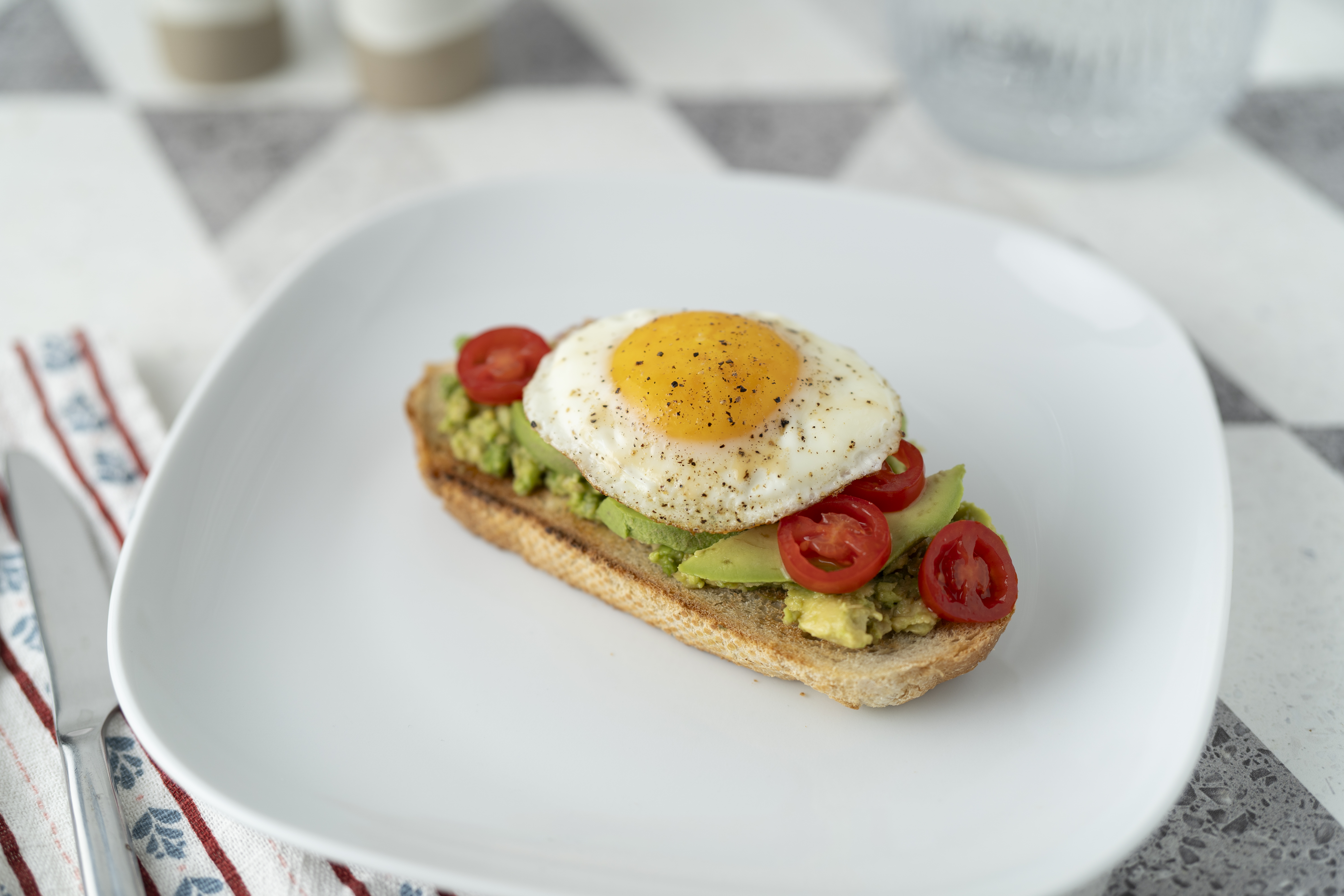 Step 5 -Top the avocado layer with the tomatoes and the egg.