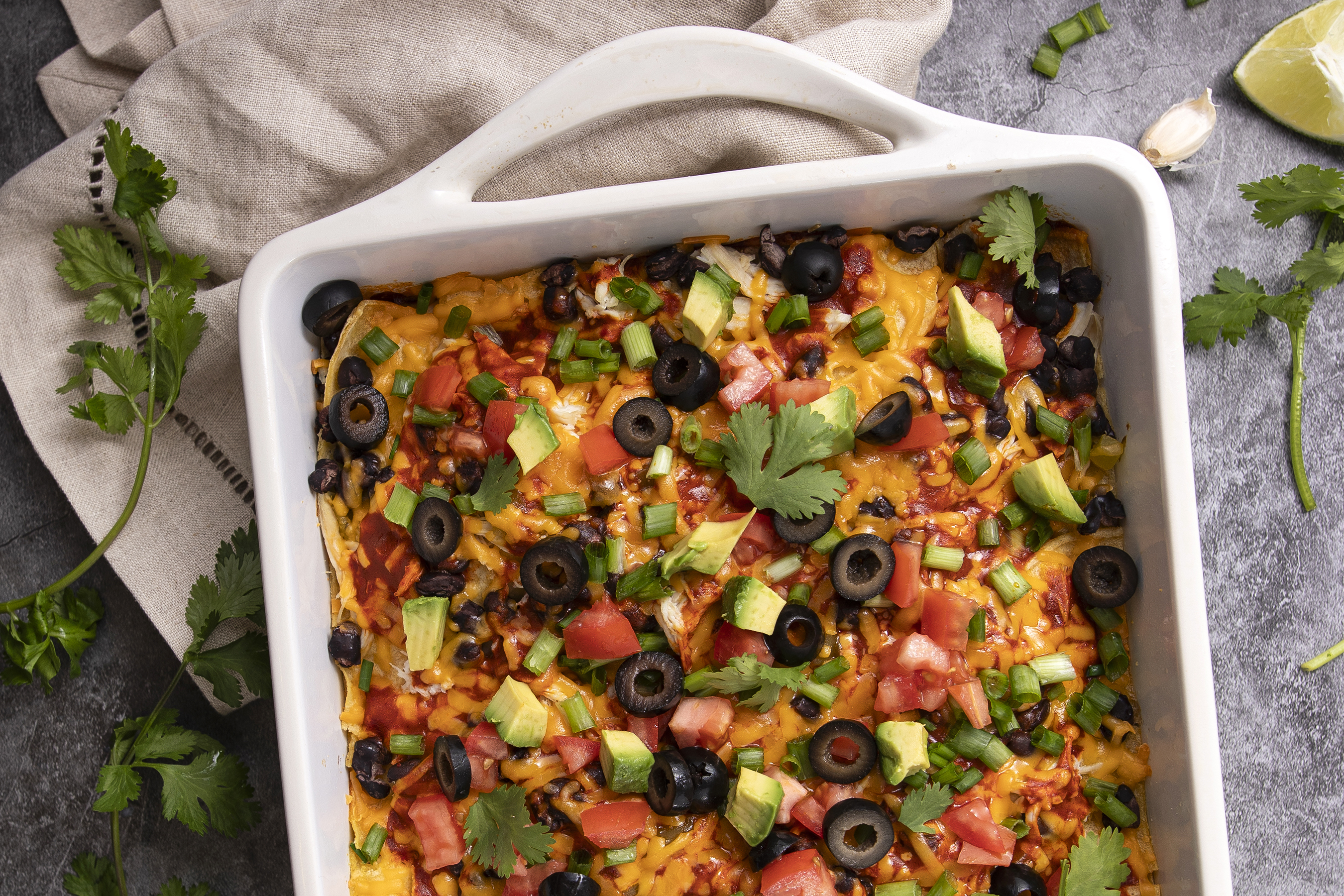 Poker Night Enchiladas are here to help feed you and a card table of your friends in the best way possible! Layers of tender tortillas, juicy chicken, and spicy red enchilada sauce are nestled between melty cheese and hearty black beans, then baked until bubbly! You'll definitely find yourself with a winning hand with Poker Night Enchiladas on a plate by your side! Your taste buds will certainly be going home with a winning feeling!