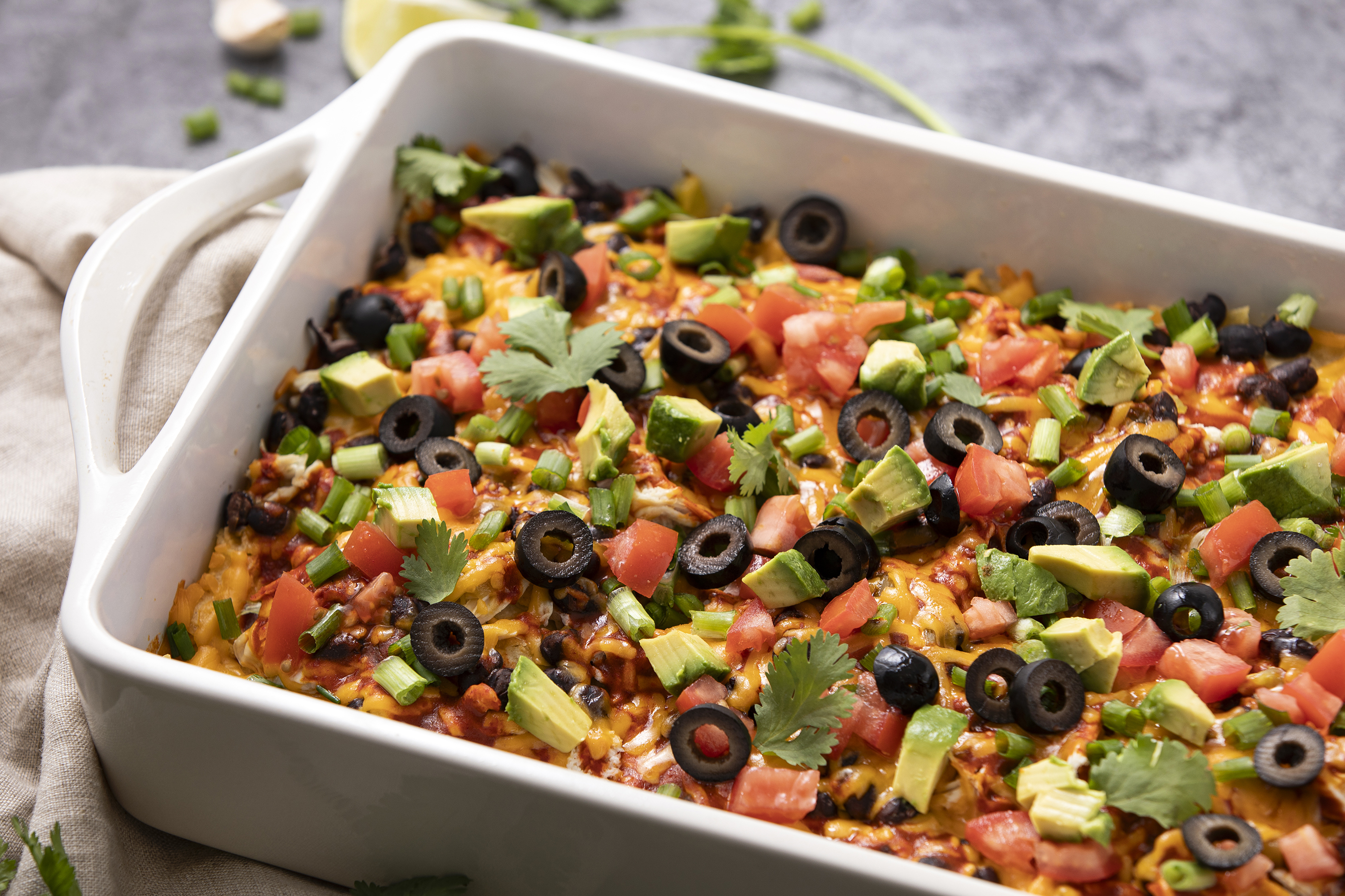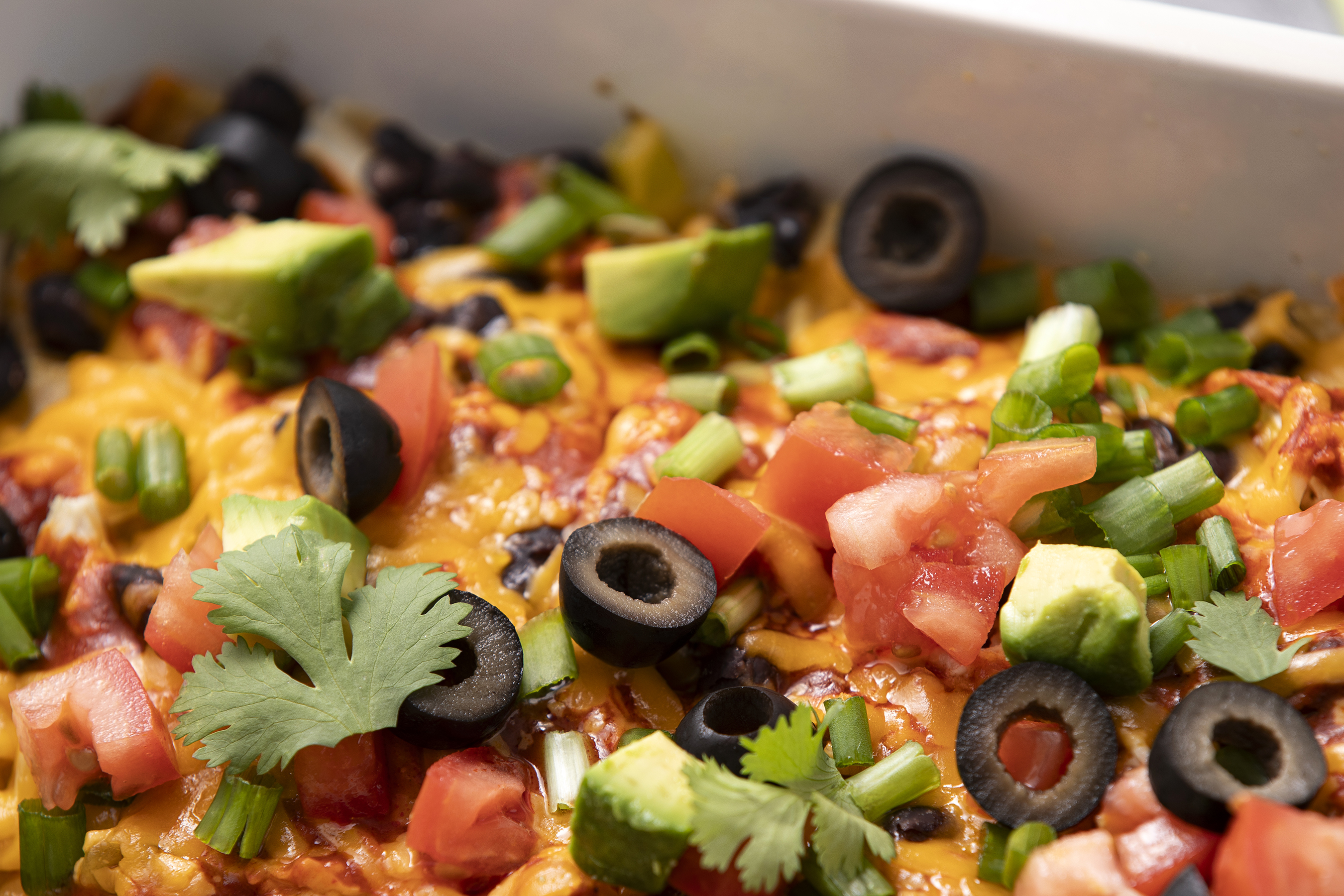 Step 12 -Top the casserole with the green onions, the tomatoes, the avocado, the olives, and the cilantro leaves.