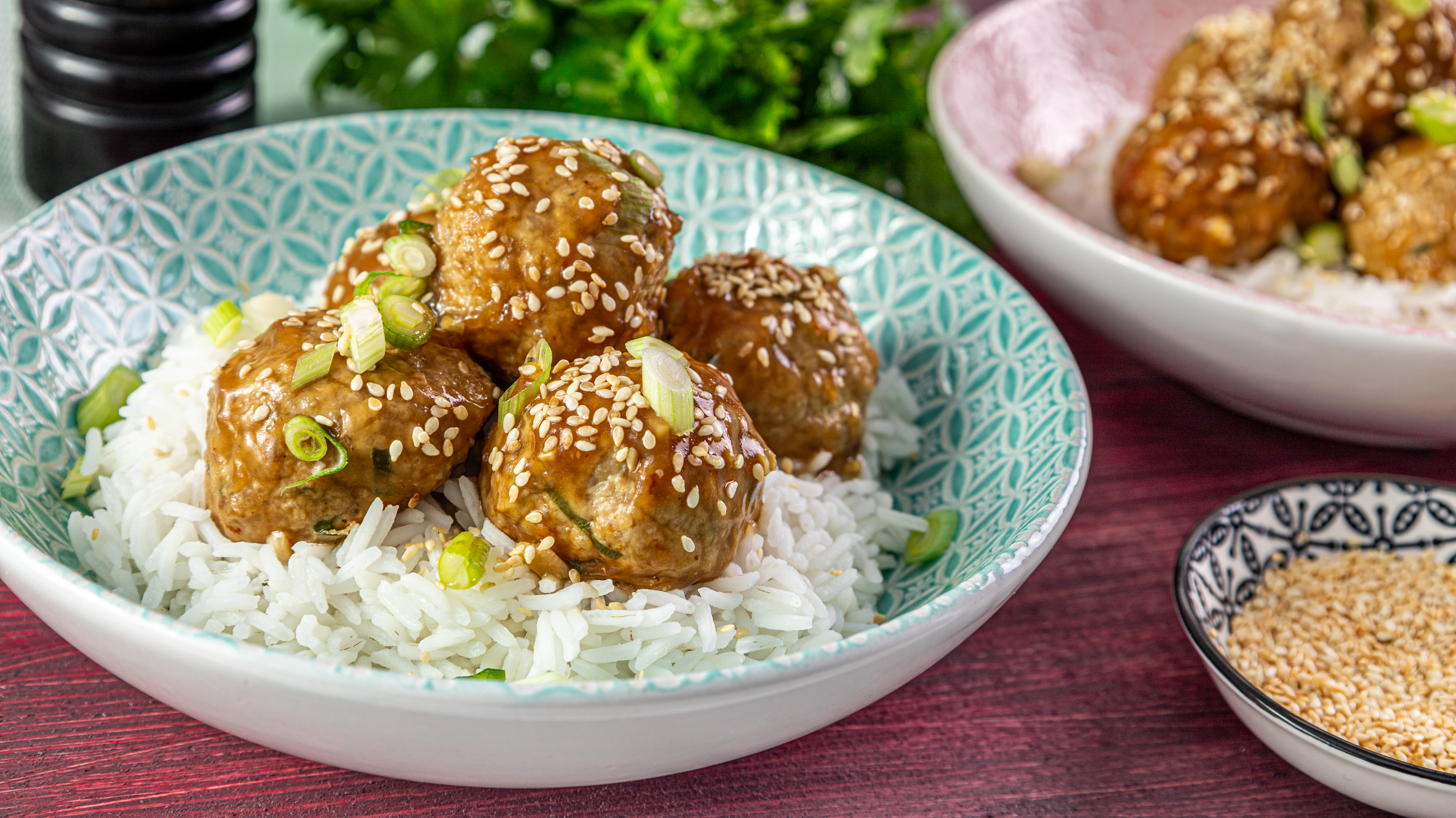 Step 9 -Serve the meatballs over the rice, drizzled with the sauce and garnished with the extra scallions and the toasted sesame seeds.
