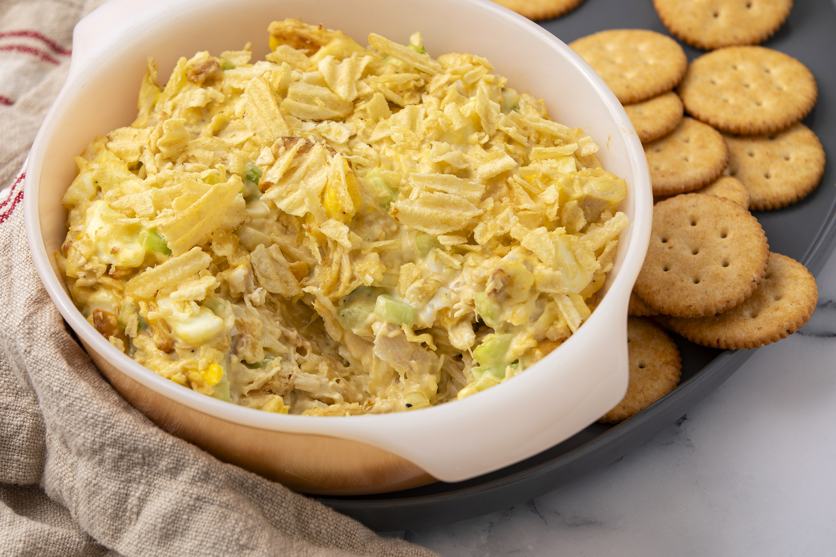 All that glitters isn't gold, but golden is the flavor and experience of this Southern Treasure Bake! Topped with the crispy golden crunch of potato chips, this savory sensation is filled with juicy chicken and hearty eggs in a creamy, poultry-flavored sauce. It's perfect for serving up as a meal atop lettuce or even as a dip! Southern Treasure Bake is one treasure you shouldn't let stay buried!