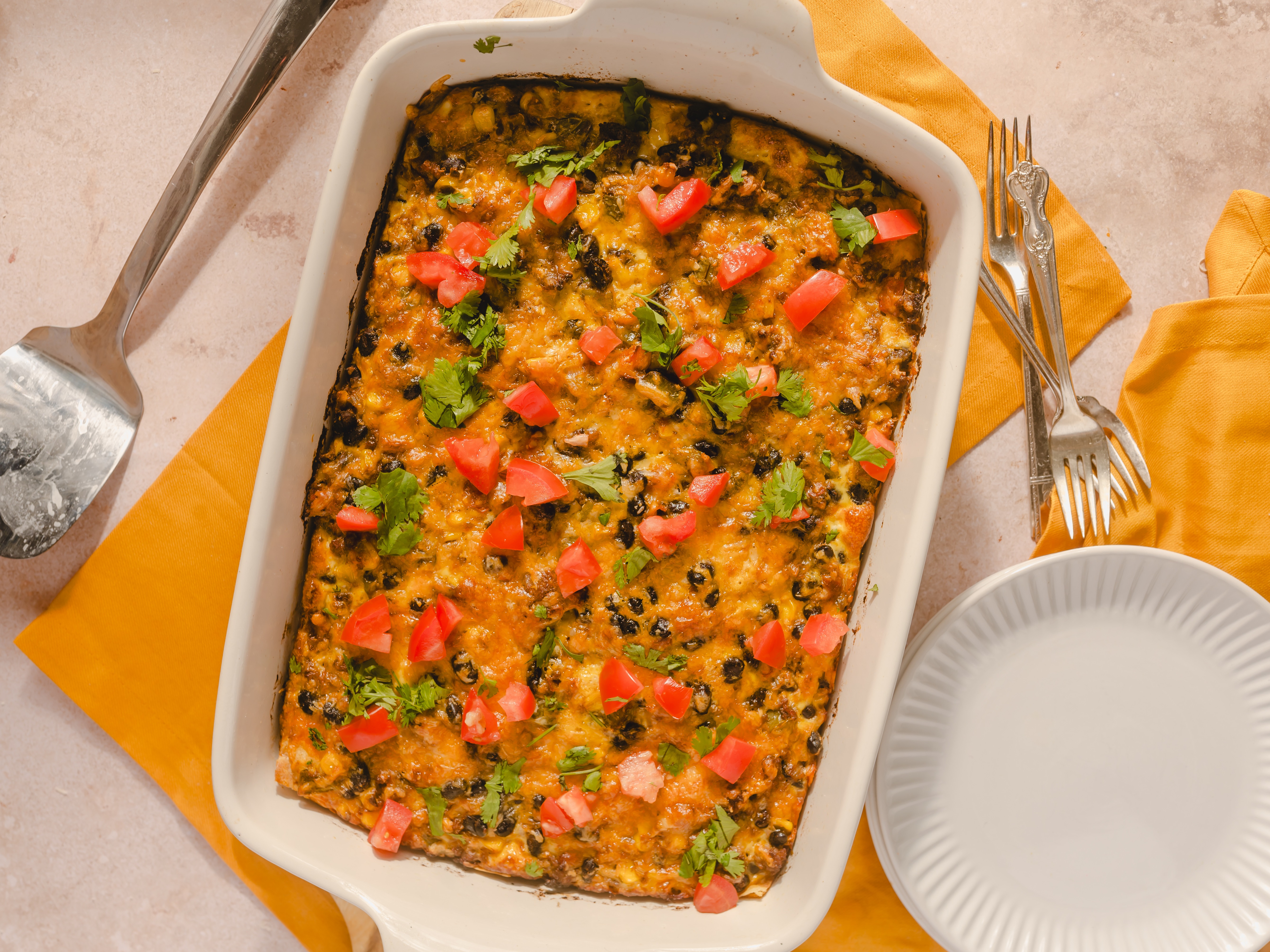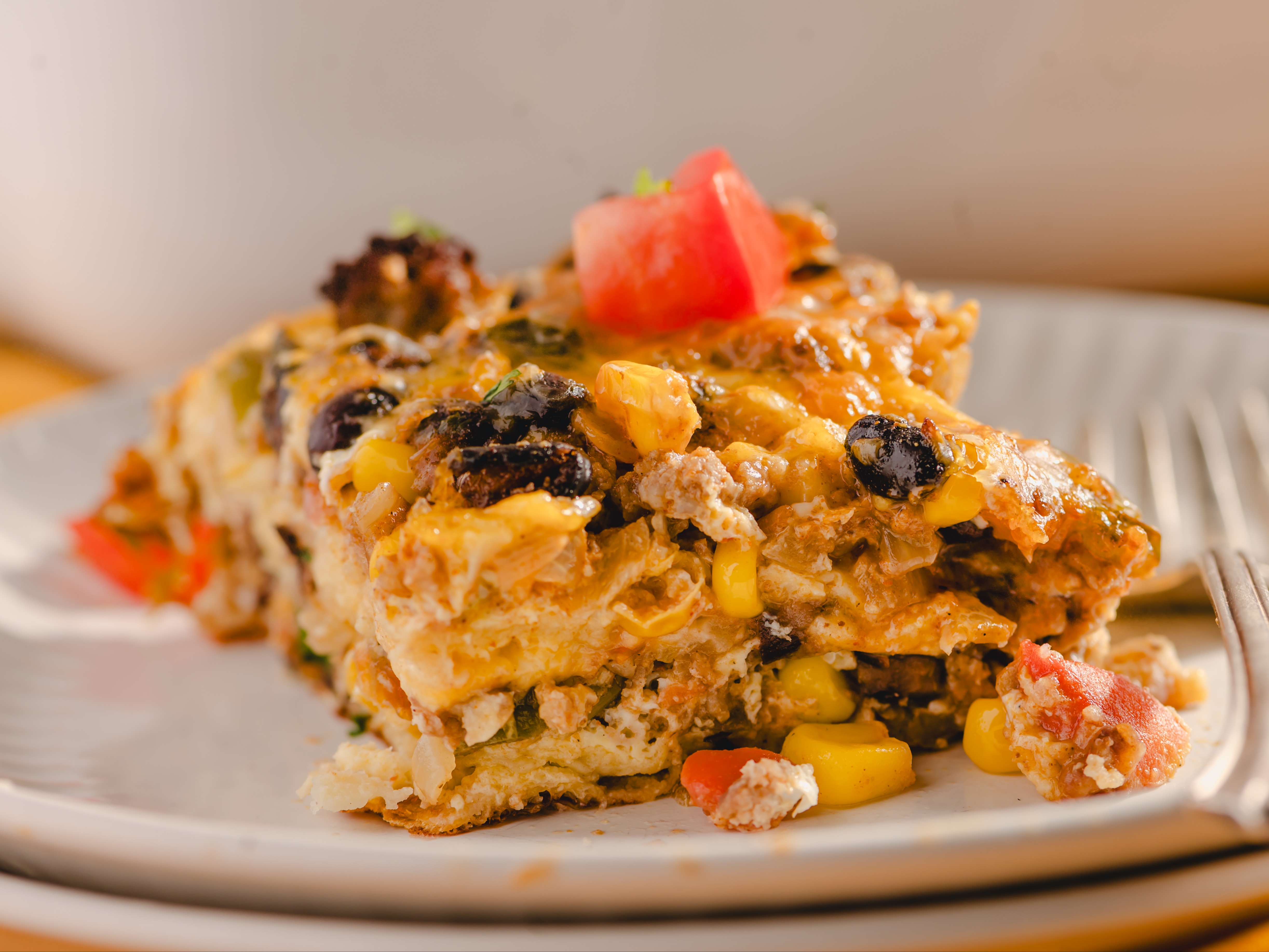 Step 10 -In the bottom of the prepared baking dish, evenly layer 1/2 of the tortilla pieces, then evenly top with 1/2 of the sausage mixture, 1/2 of the egg mixture, and 1/2 of the cheese. Repeat the layers once.