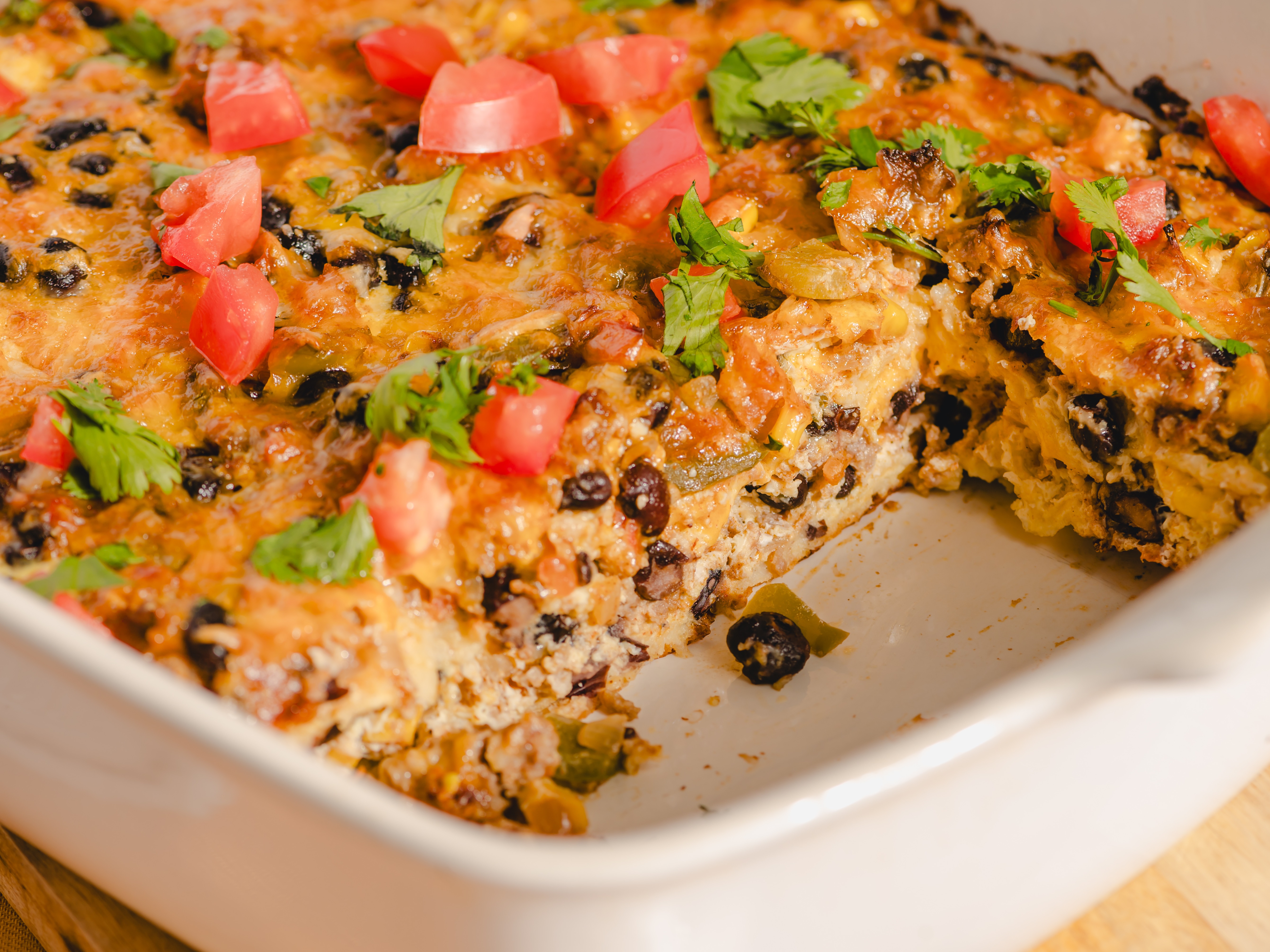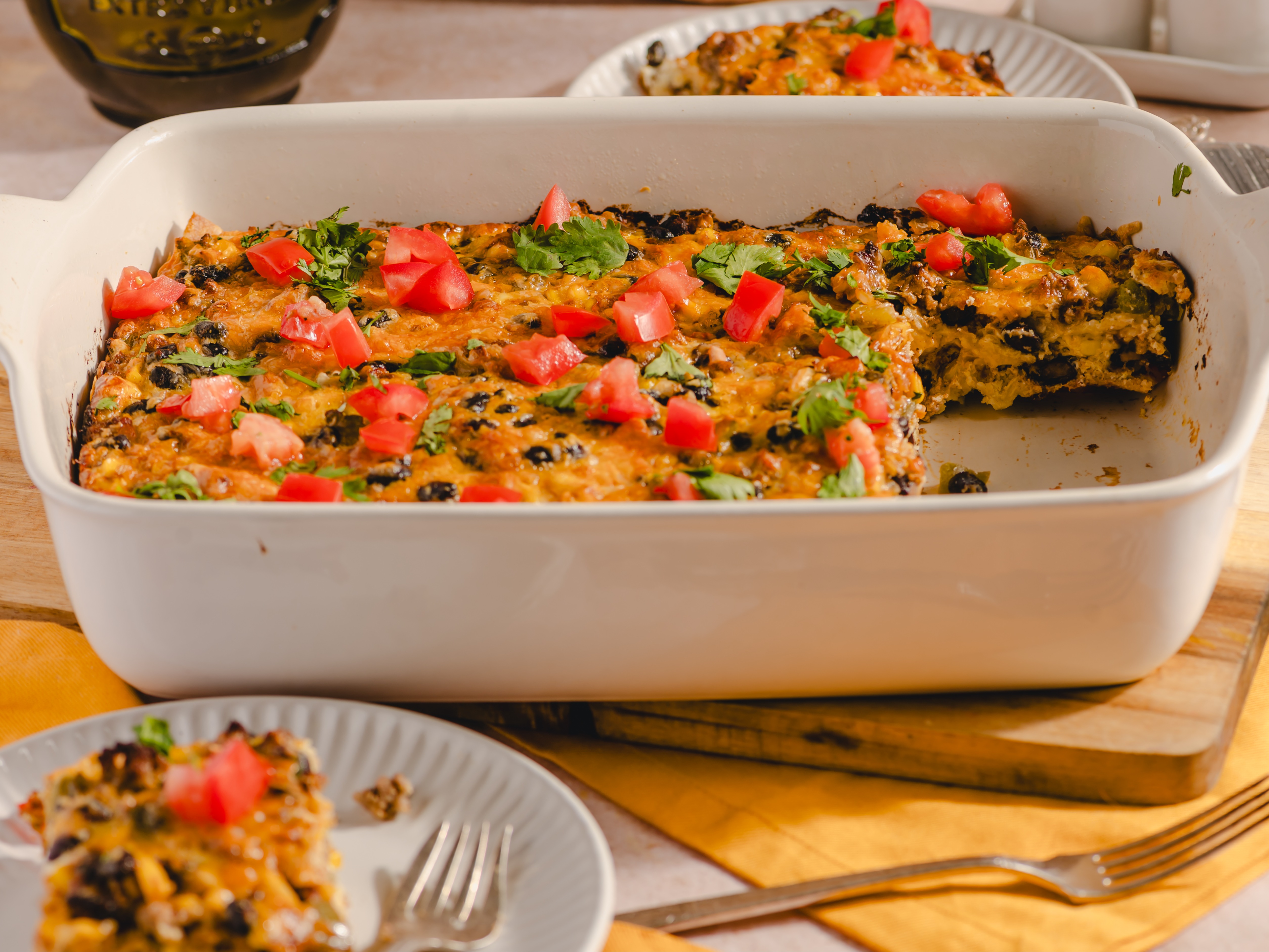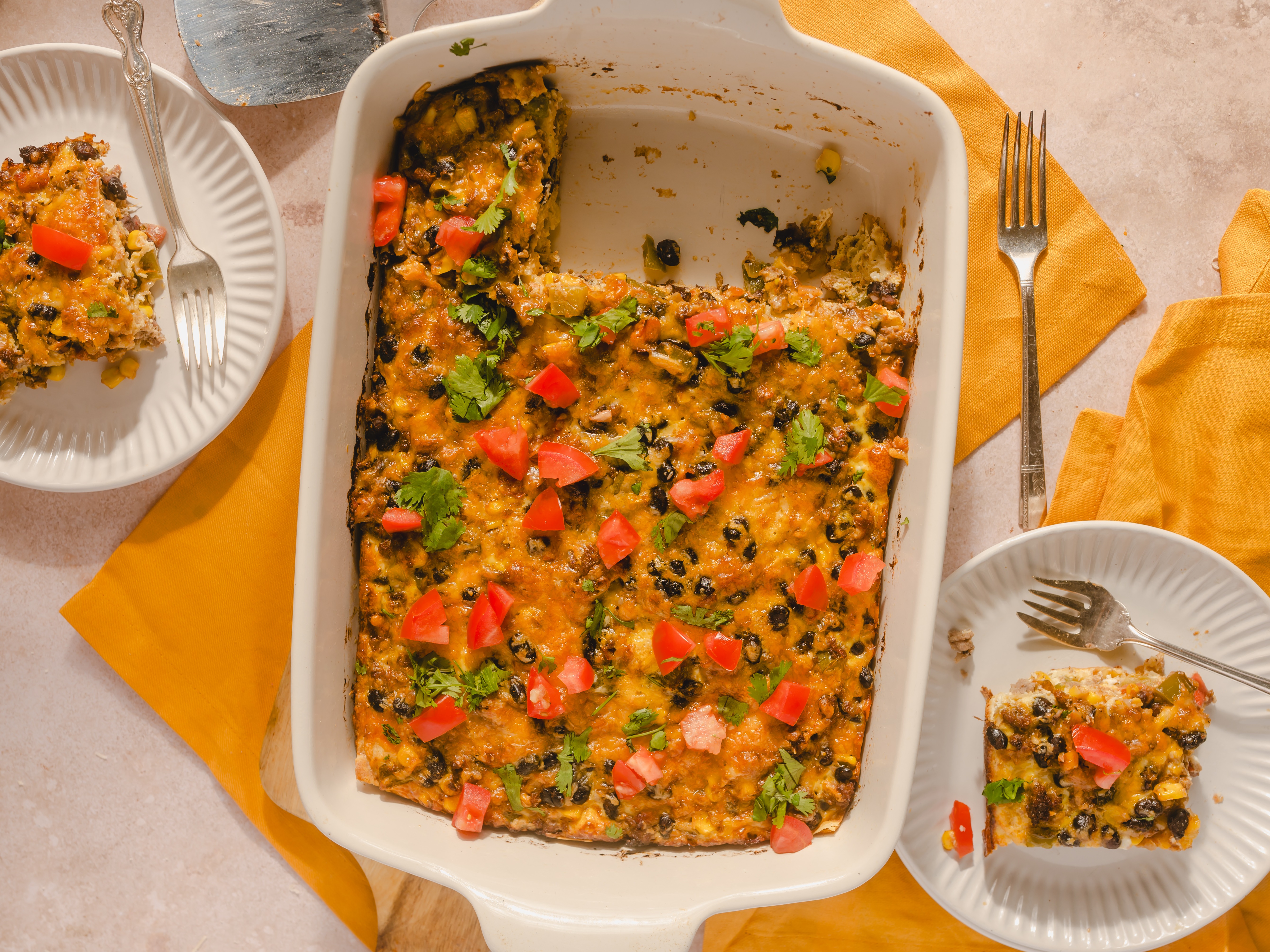 ¡Buenos dias! The way to an A+ day is starting it off with this Spanish Class Breakfast Bake. Waking up with a taste of Tex-Mex really is the way to go. The combination of juicy veggies, spicy sausage, hearty beans, and melty cheese really ace the breakfast test! Rise and shine, Spanish Class Breakfast Bake is in session!