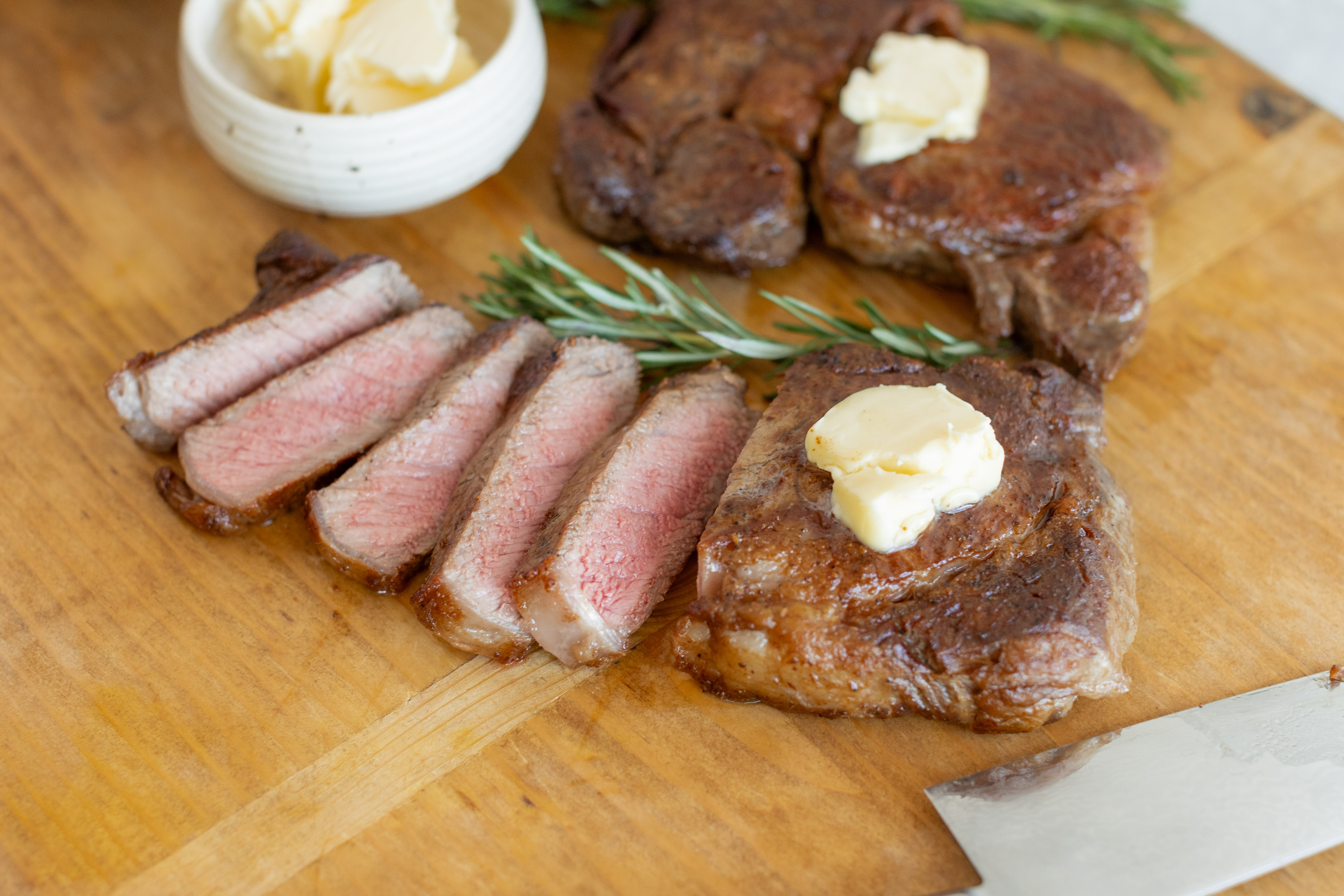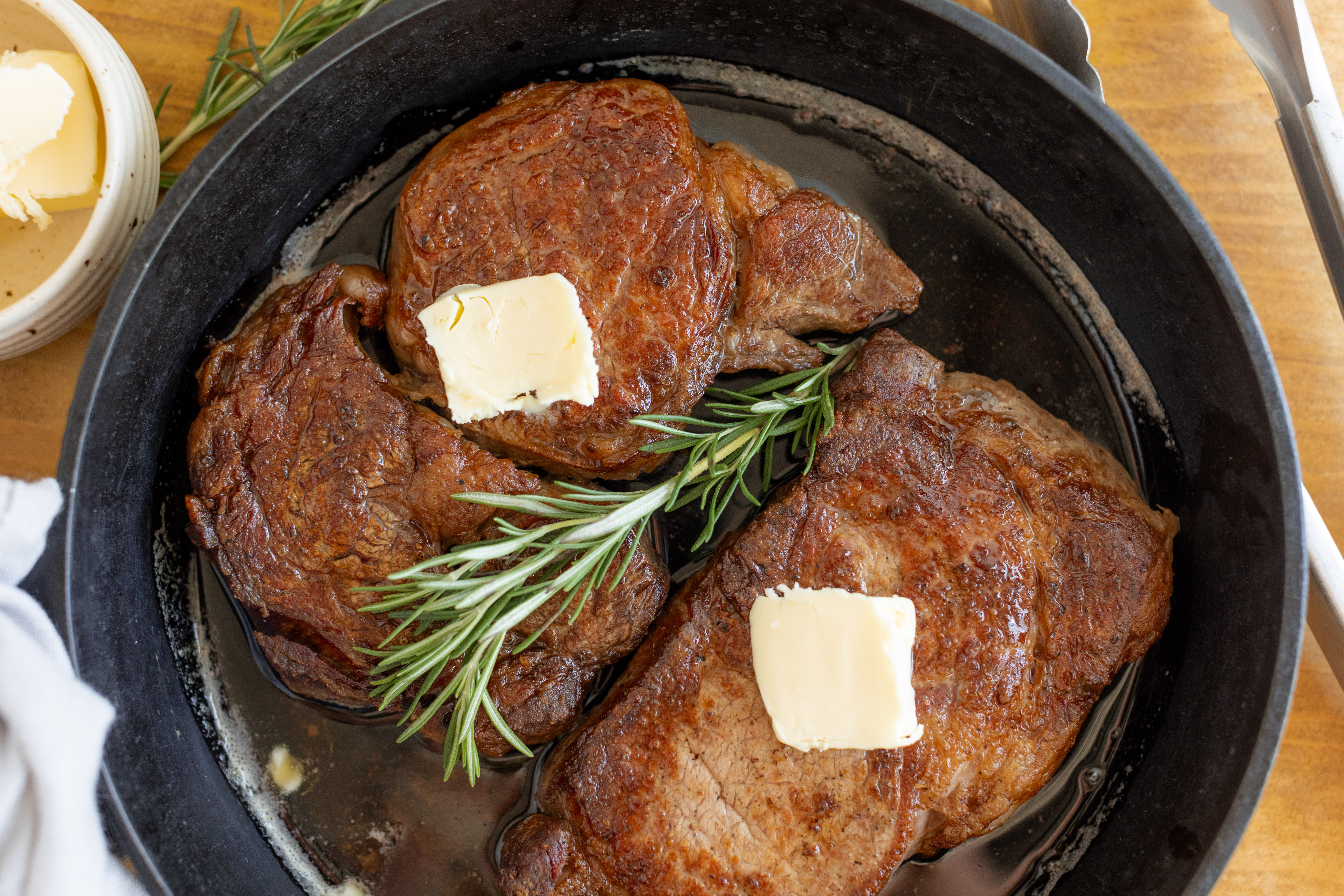 Step 10 -Baste the steaks using the melted butter, tilting the pan so the butter pools and is easy to scoop up with a spoon, and continue butter-basting the steak for about 1 minute. If you desire more doneness, leave the steaks on for longer, continuing to butter-baste the steaks as they cook.