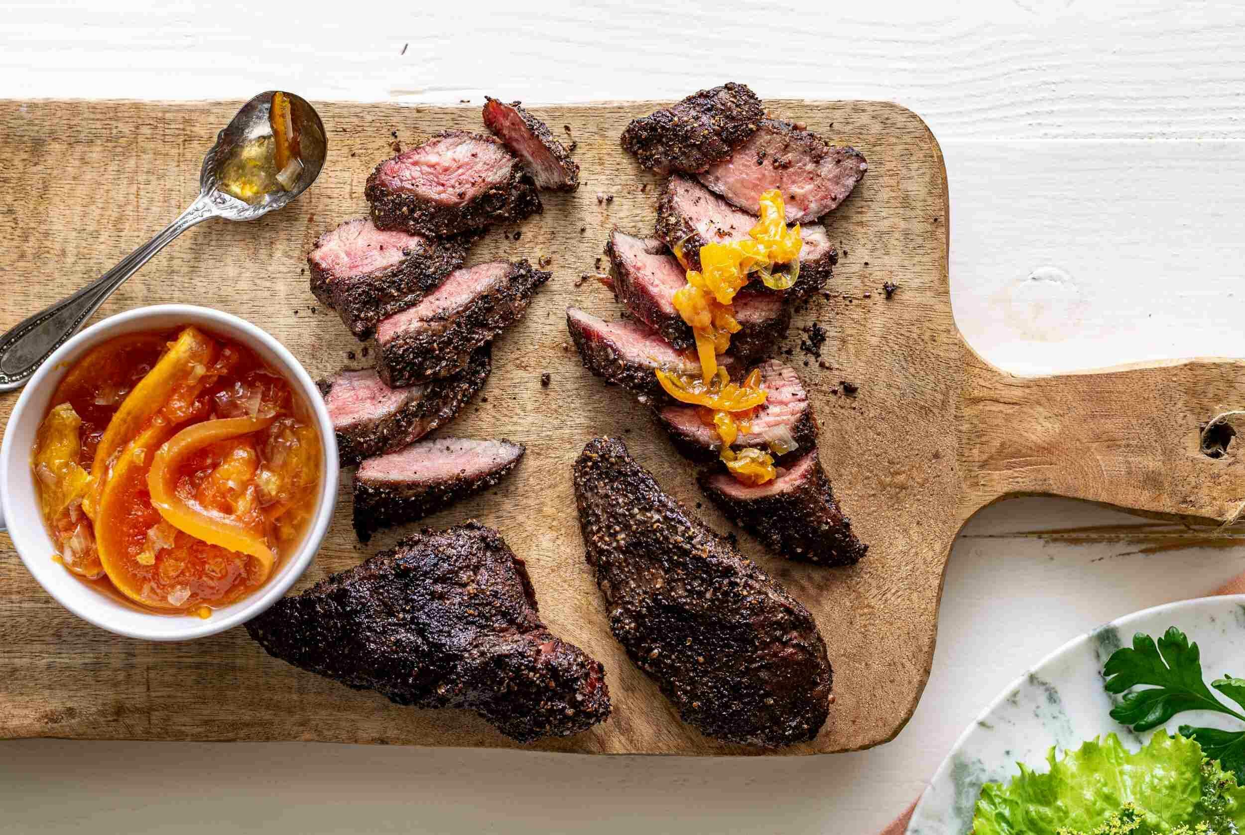 Steak & Citrus Chutney is an upscale yet simple main course that encompasses all things summertime! Heat up your grill to lightly char the juicy hanger steaks, tossed in a sweet and savory ground coffee and cocoa powder-infused homemade rub. Plating the fulfilling slabs brings on more warm weather hints, thanks to the made-from-scratch chutney that brings in a syrupy and citrusy bright flavor. Steak & Citrus Chutney is literally a taste of that sweet, sweet summertime (without skimping out on the savory)!