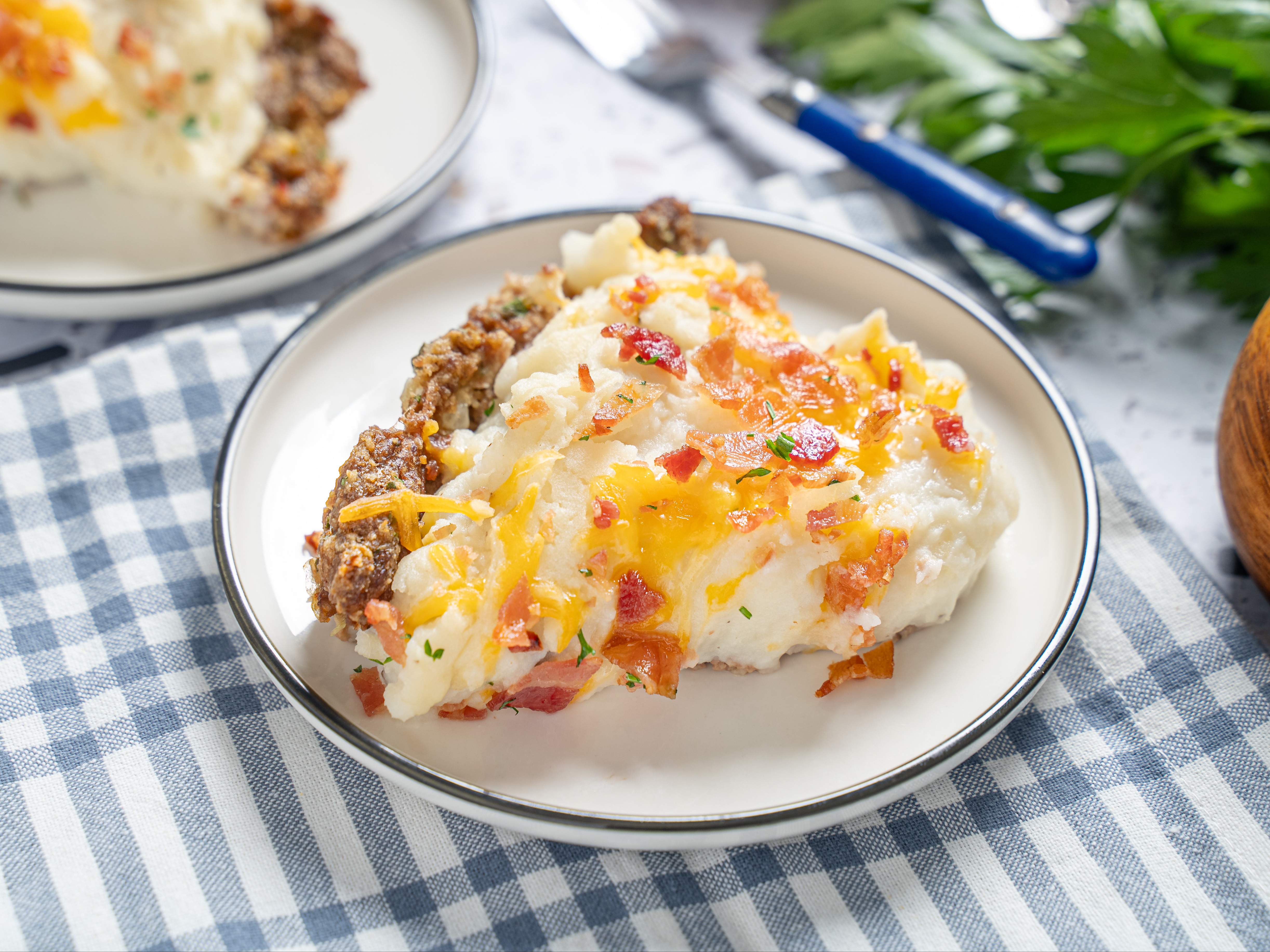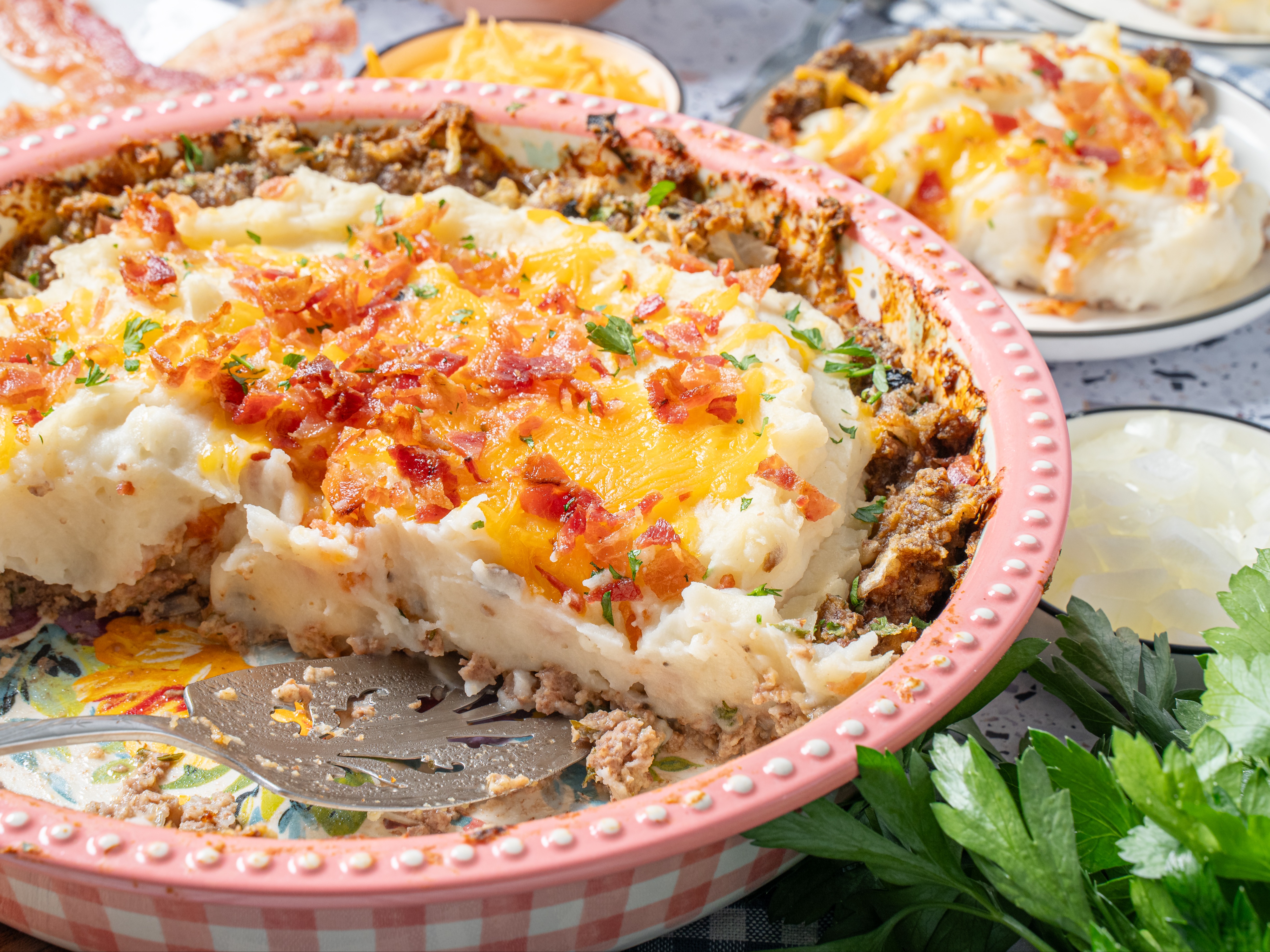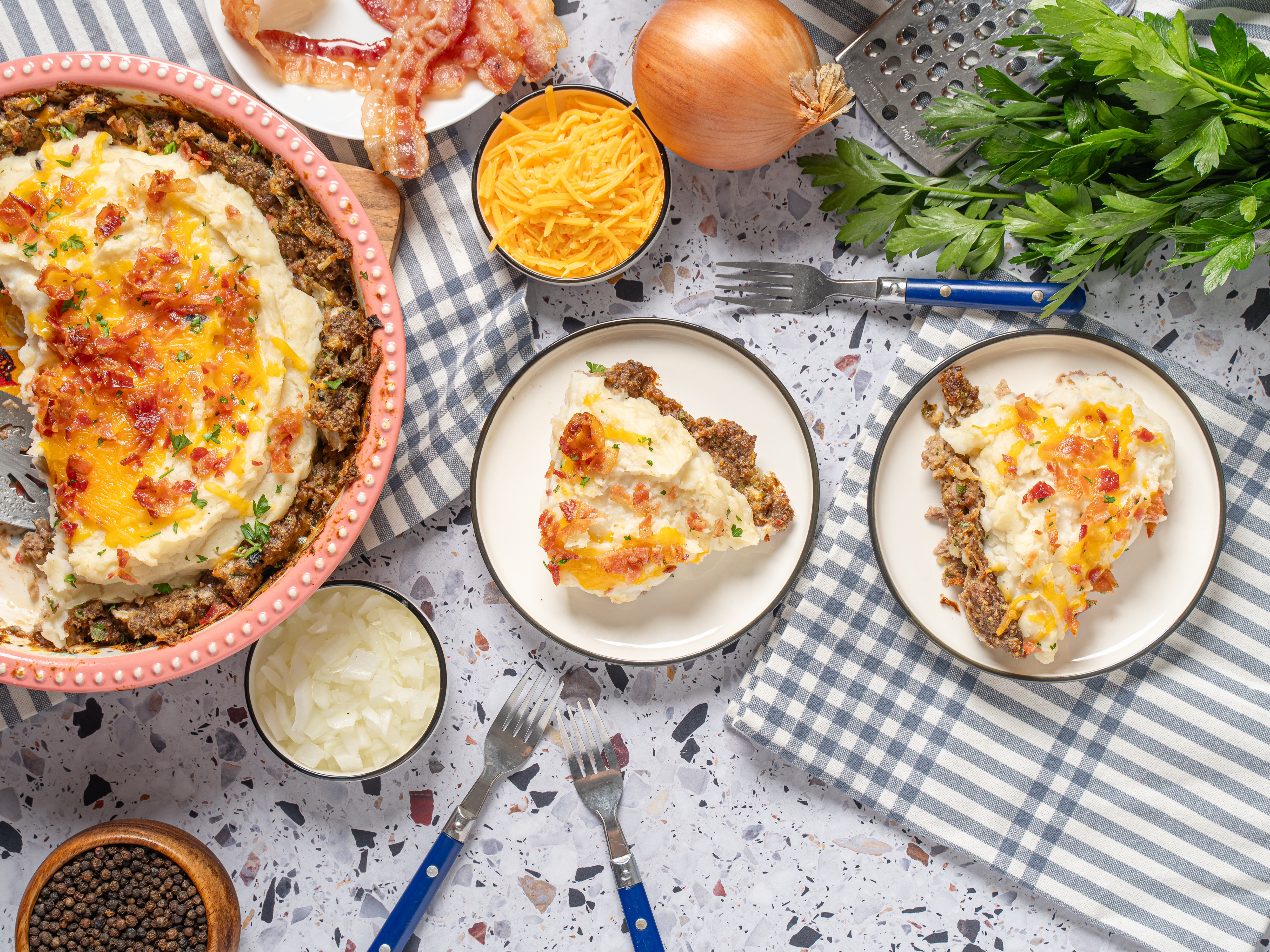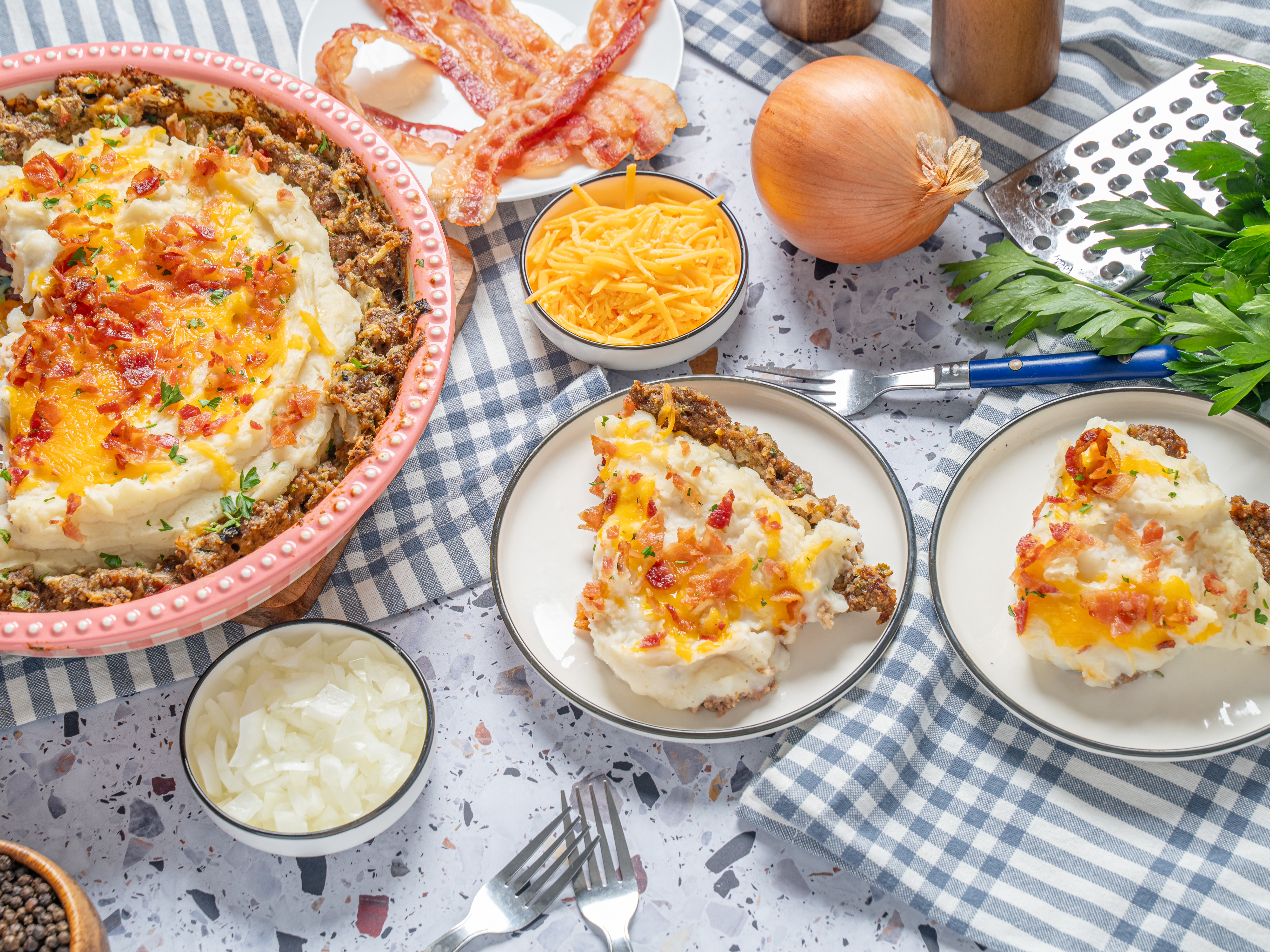 Sunday Guest Special is a hearty dish that is basically a cross between a shepherd's pie and a loaded baked potato. Yum! What a wonderful way to extend a happy greeting to a special guest at your table! A savory beef and onion base is mixed with creamy mushroom soup and topped with a layer of fluffy mashed potatoes. The dish is then finished off with crispy, succulent, crumbled bacon and melted cheddar cheese for an indulgent and filling twist. This Sunday Guest Special is the perfect way to treat all of your guests to a deliciously comforting meal that'll have everyone asking for seconds! It's only polite to serve your guests first... but make sure you save some for yourself too!