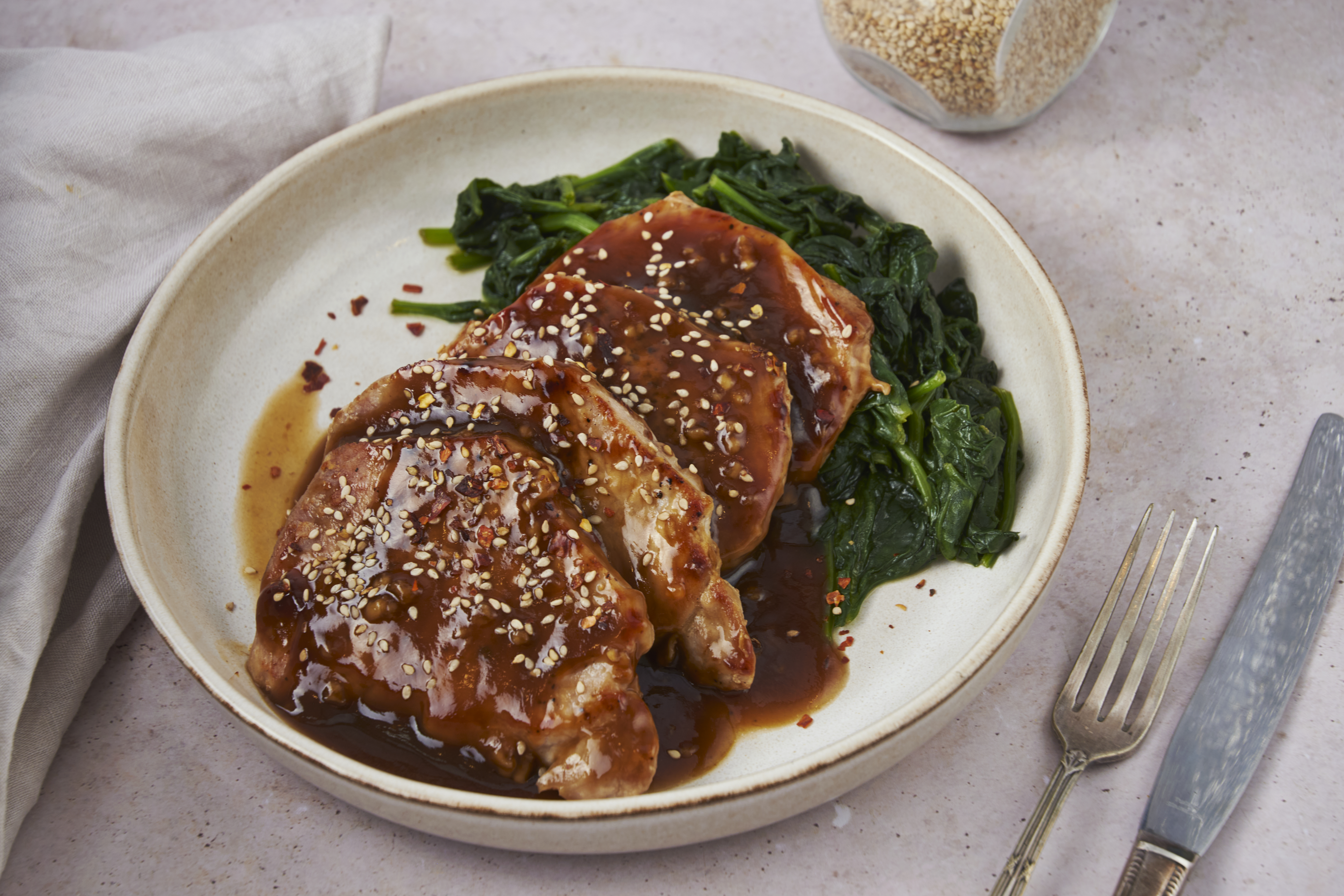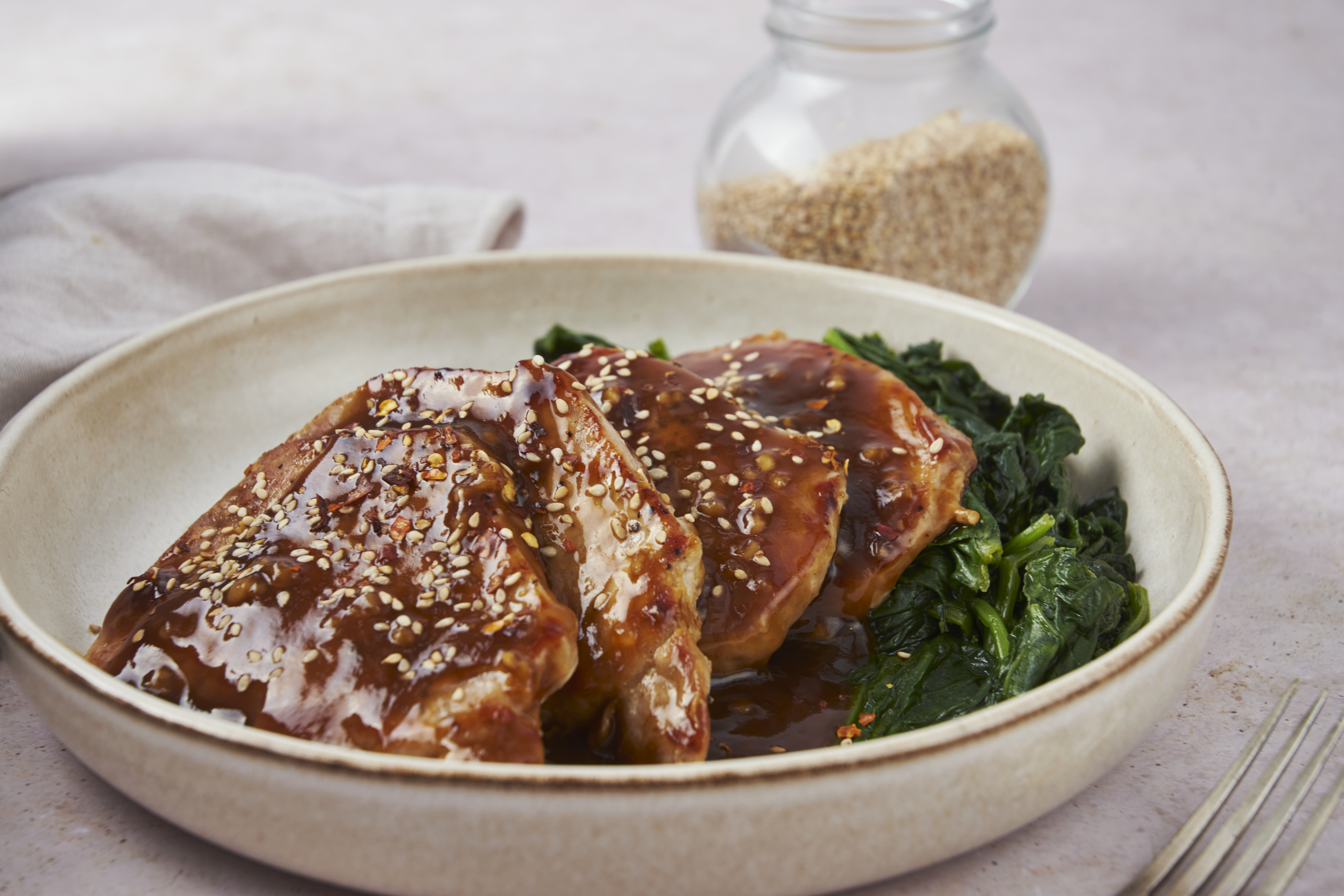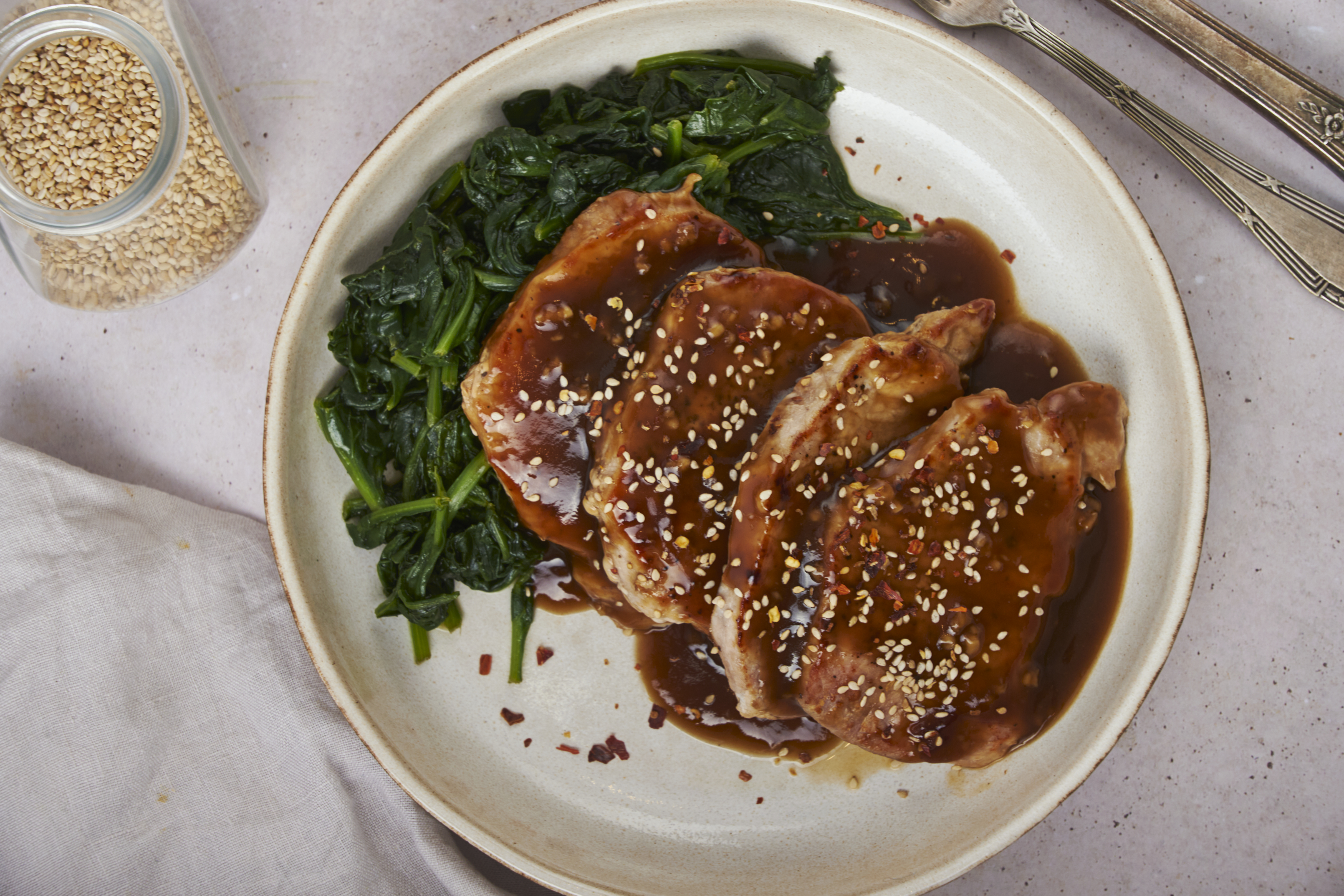 Step 12 -Serve the chops with the sauce, garnished with the extra red pepper flakes and the sesame seeds.