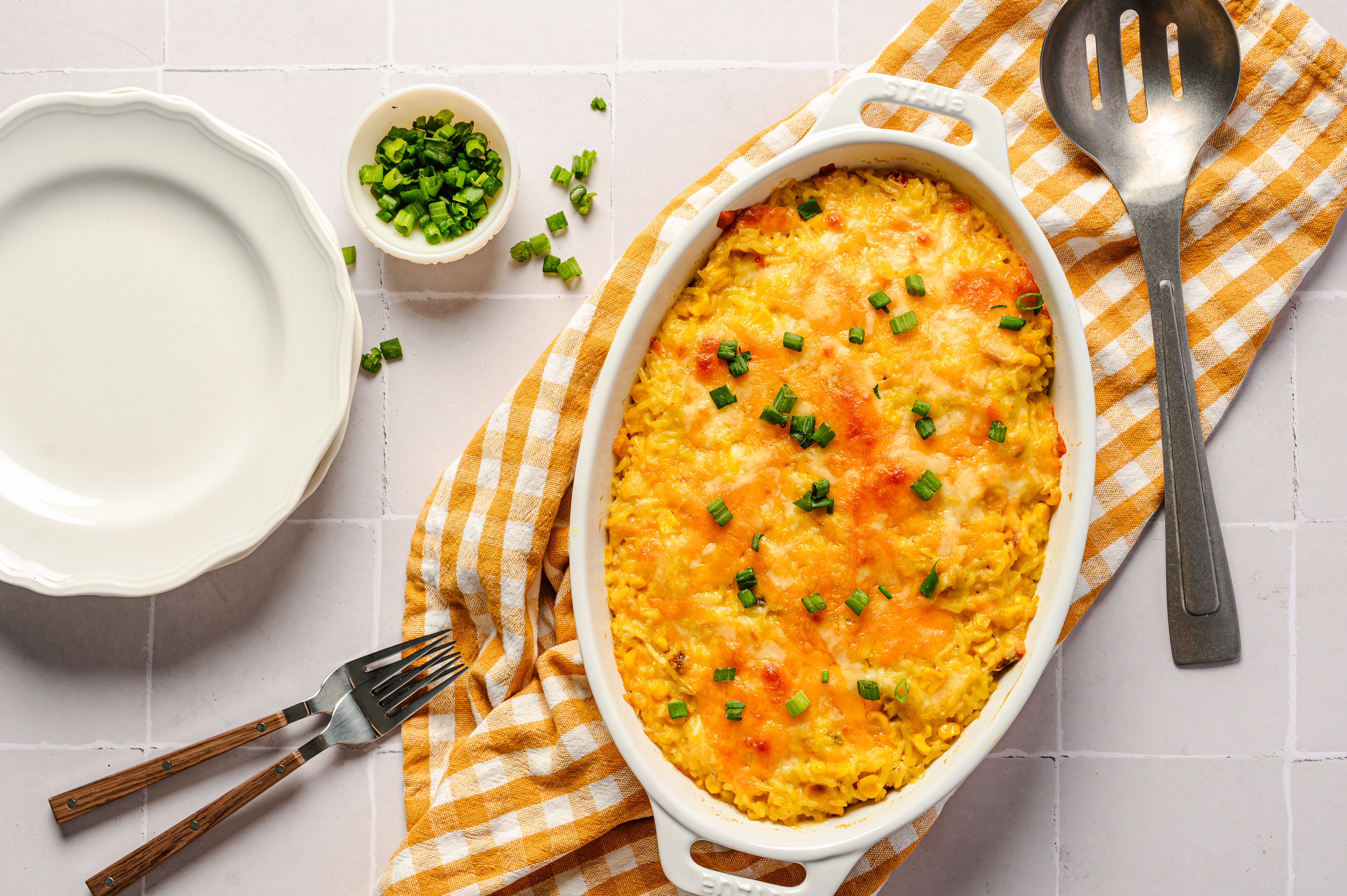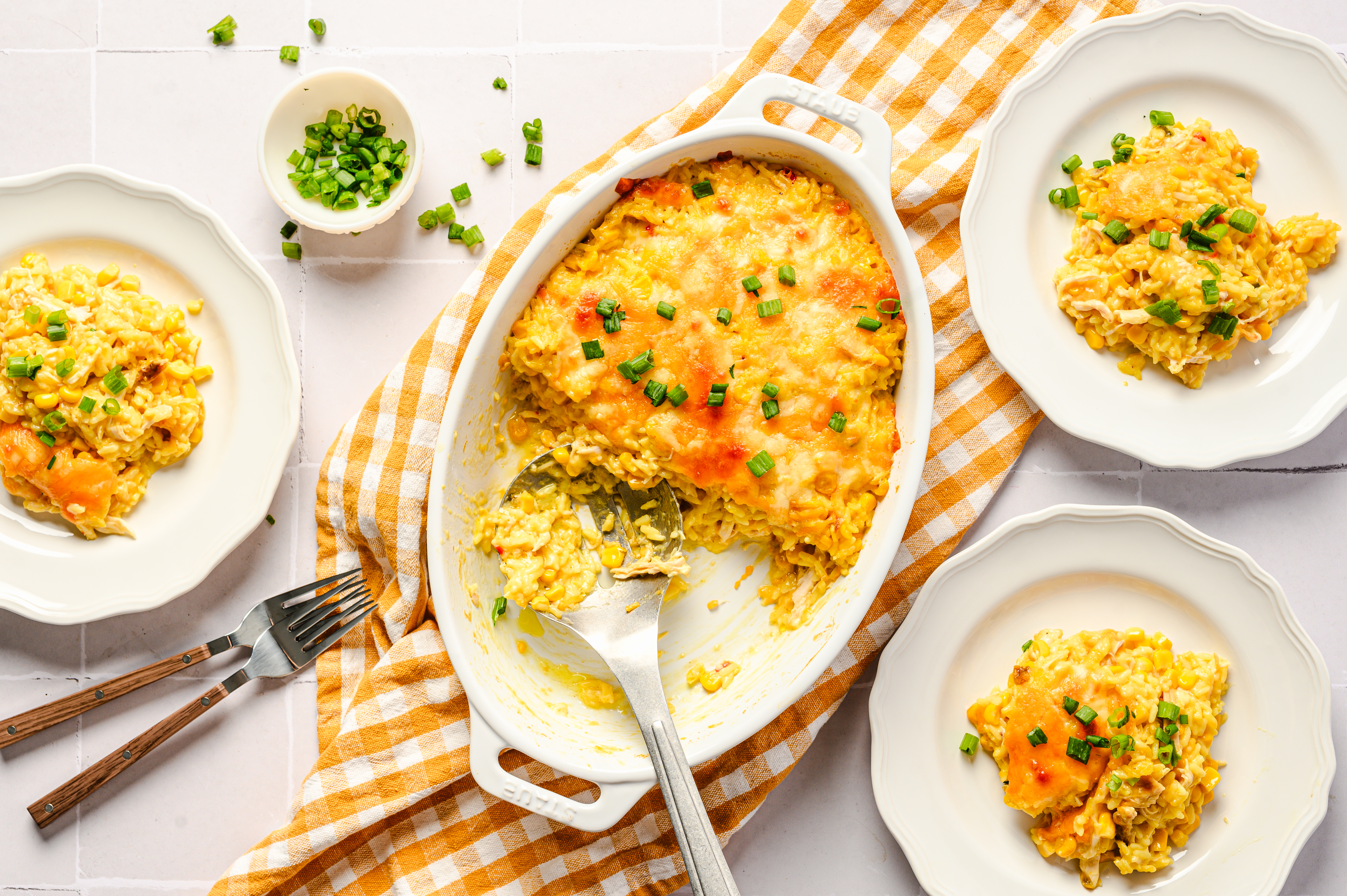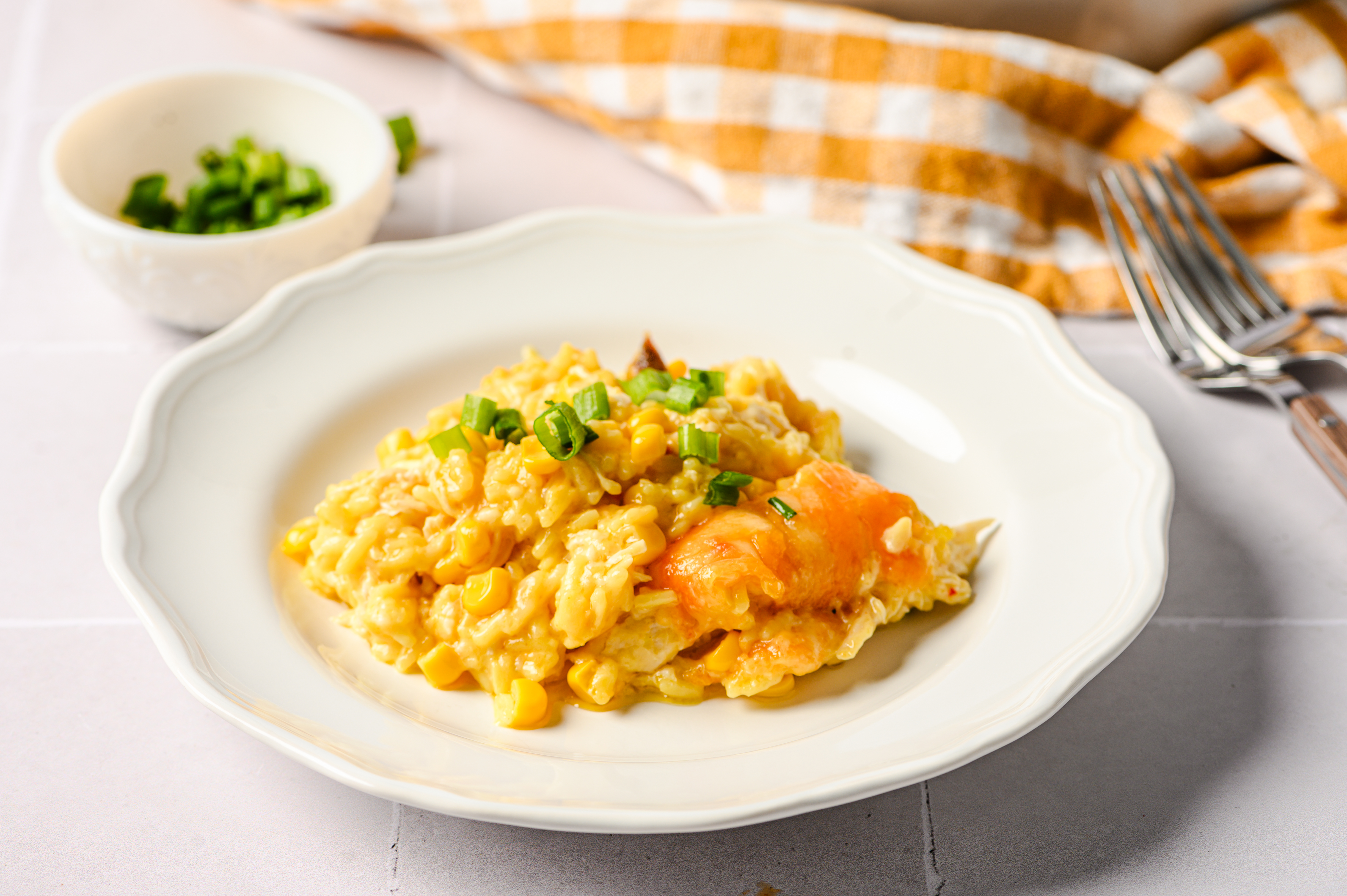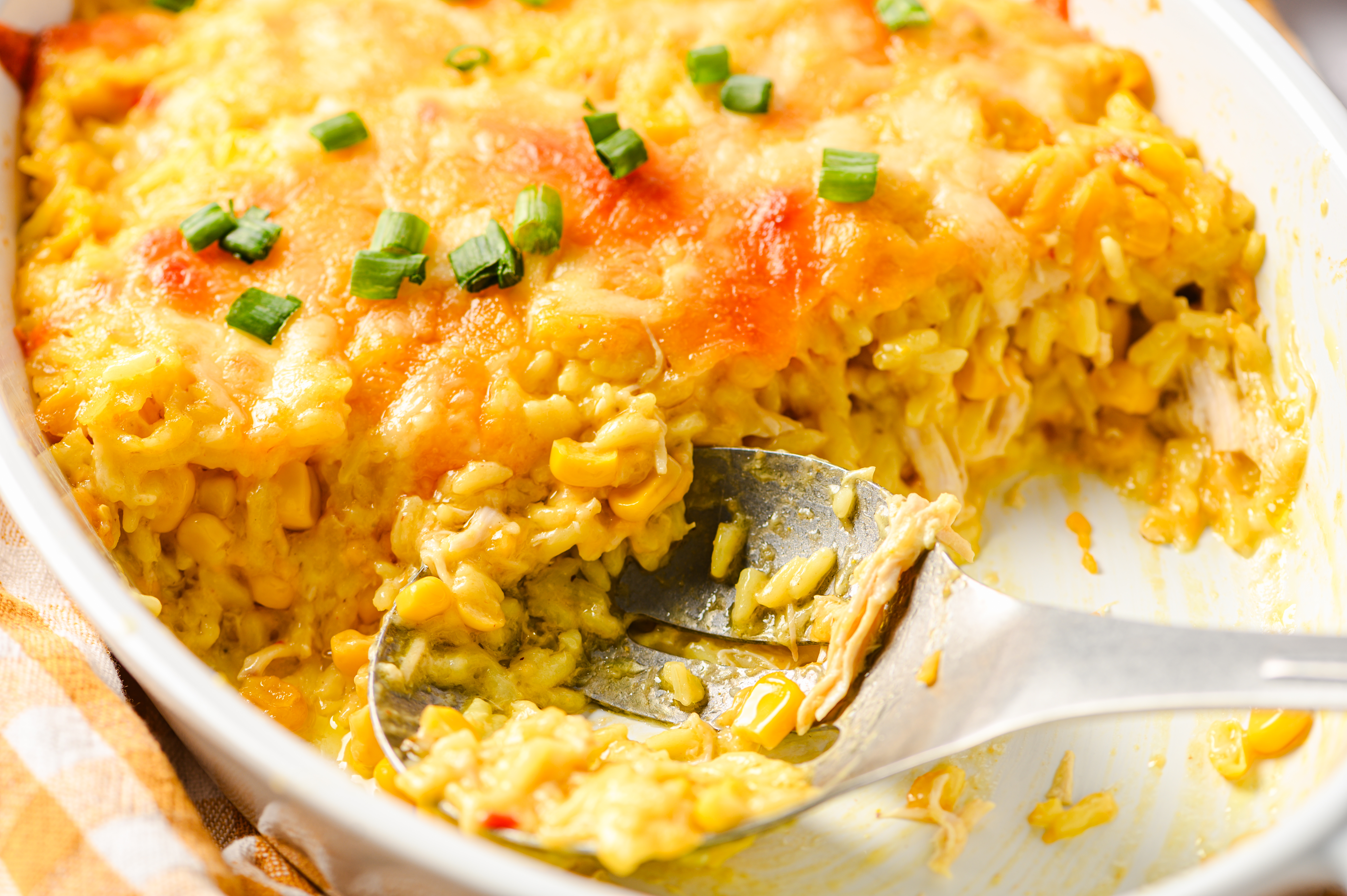 Despite its name, this Sweet-on-You Bake isn't a dessert casserole; instead, it's a hearty, wholesome, savory dinner that you'll want to make for the people you care about the most! The yellow rice adds body to the cheesy, creamy, poultry-flavor sauce and the succulent chicken! The summer corn and sharp cheese topping help show just how much affection the Sweet-on-You Bake has for your tastebuds! Show a little extra love with this bake!